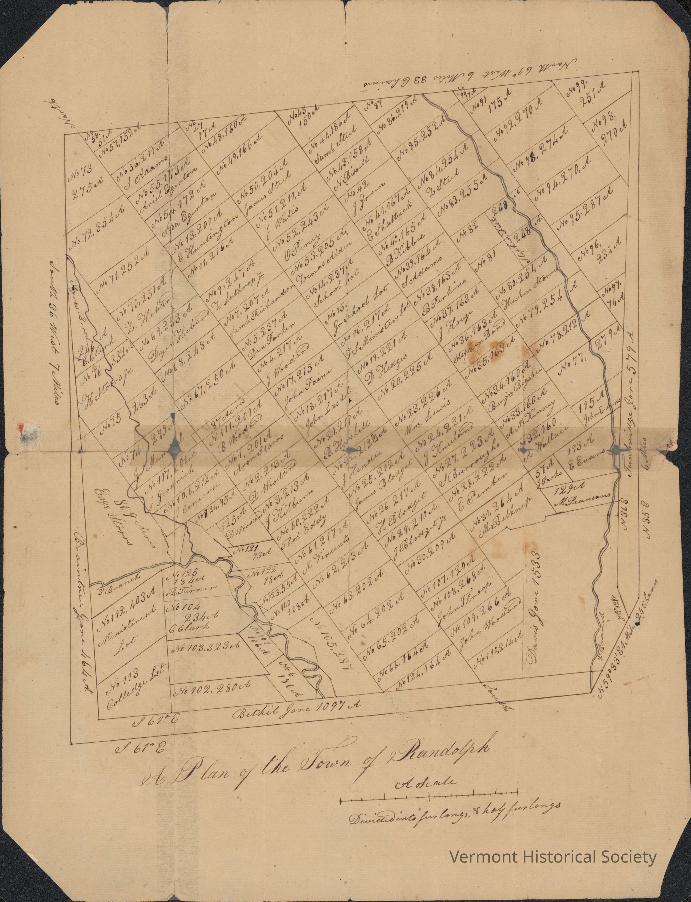 During the earliest European settlement of Vermont, land speculators often drew lotting maps and sold parcels without much regard for topography or even desirability. This map of Randolph shows that clearly: dividing up the land in straight lines, sight unseen, with the names of purchasers assigned to most parcels.