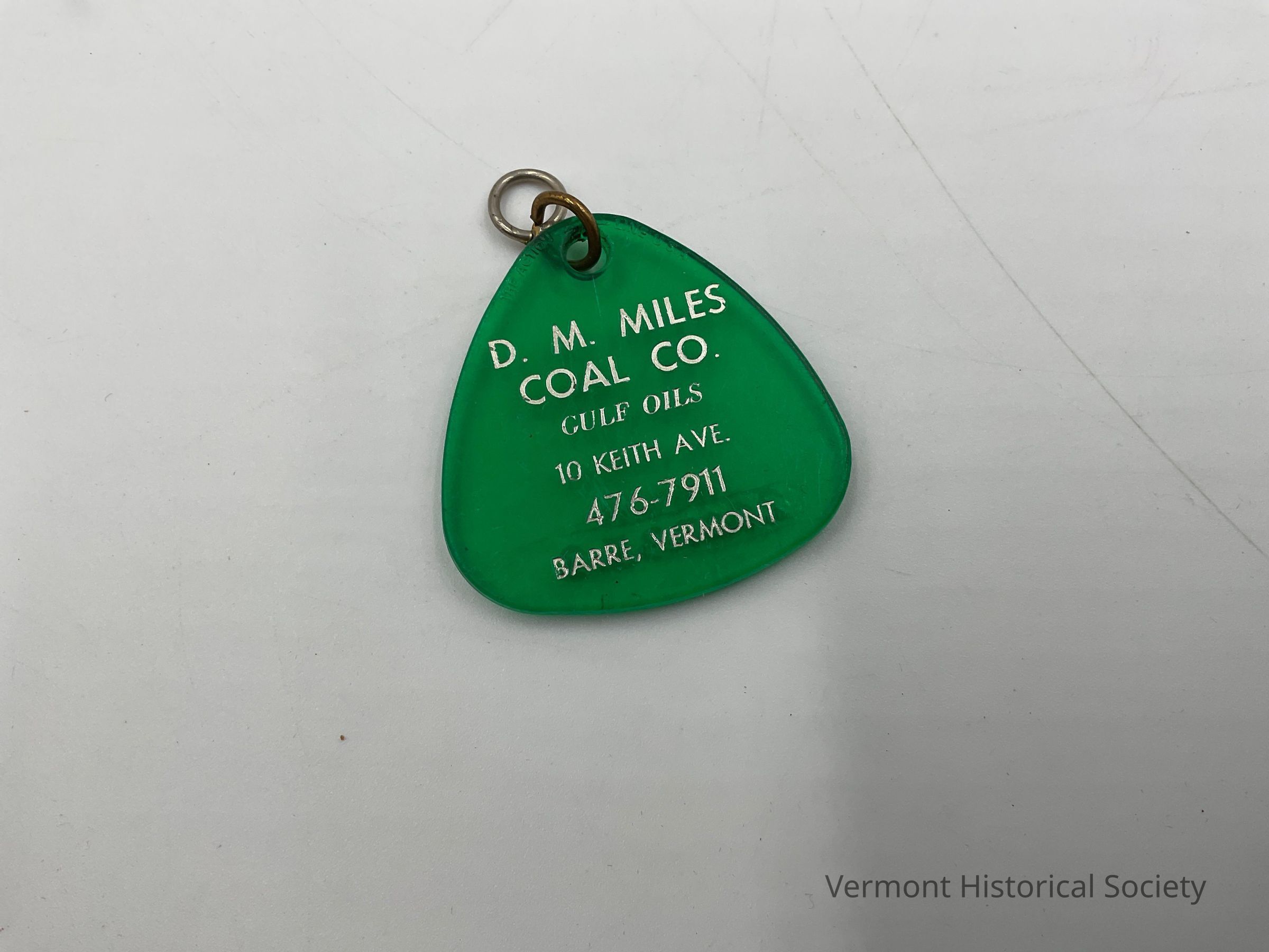 Green plastic tag from a key ring. It advertises D. M. Miles Coal Co. in Barre.Context