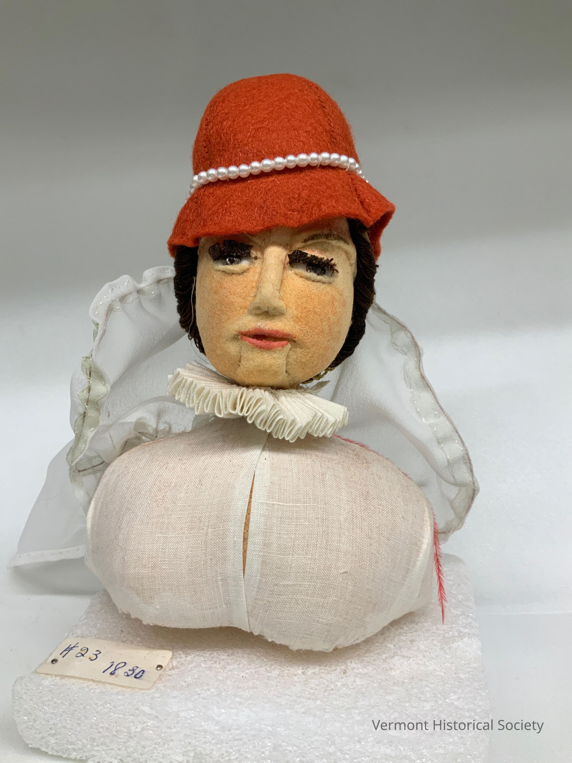 The bust is wearing a headdress consisting of a red felt bucket hat trimmed with faux-pearl beads and a sheer white veil. The veil is wired around the hem. Beneath the veil, the hair is held in a crocheted gold net.