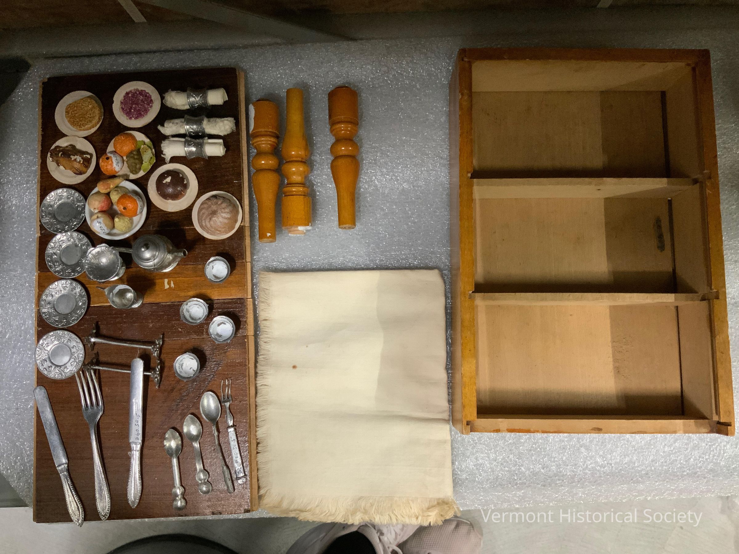 Doll's dining set, built into a box. The box consists of a four-sided base, separated into three compartments. There is a rabbet groove carved along the top of each side for a lid to slide in. The lid is finished with a dark stain on one side, becoming the table top once removed from the box. The bottom of the table (outside of the lid) has four round divots--one in each corner--for attaching the turned table legs (one now missing).