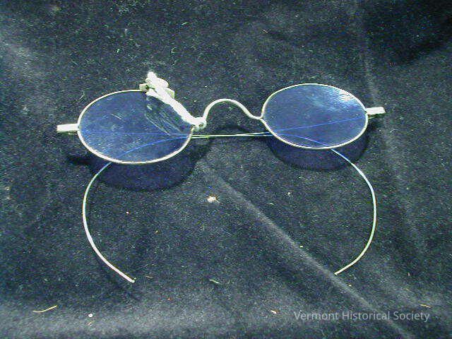 Metal framed glasses with blue-tinted oval lenses. The temples are wire and curve downward at the ends to curl around the wearer's ear.