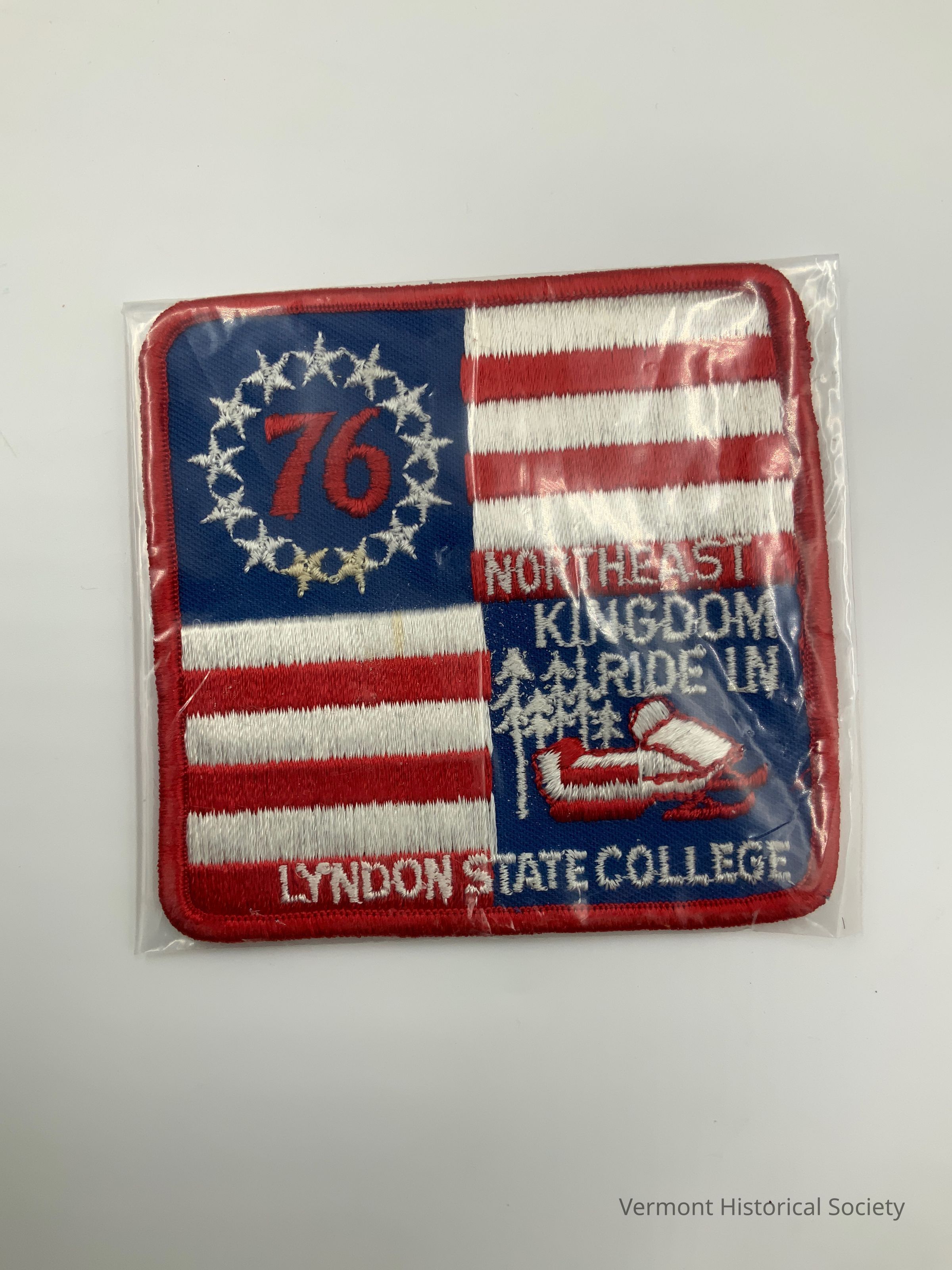 Large red, white and blue patch that includes a circle of white stars around the number 76 in red in the top left corner, red and white stripes in the top right and lower left quadrants and the words, 'Northeast Kingdom Ride In" with pine trees and a snowmobile in the lower right and "Lyndon State College" stitched across the bottom.