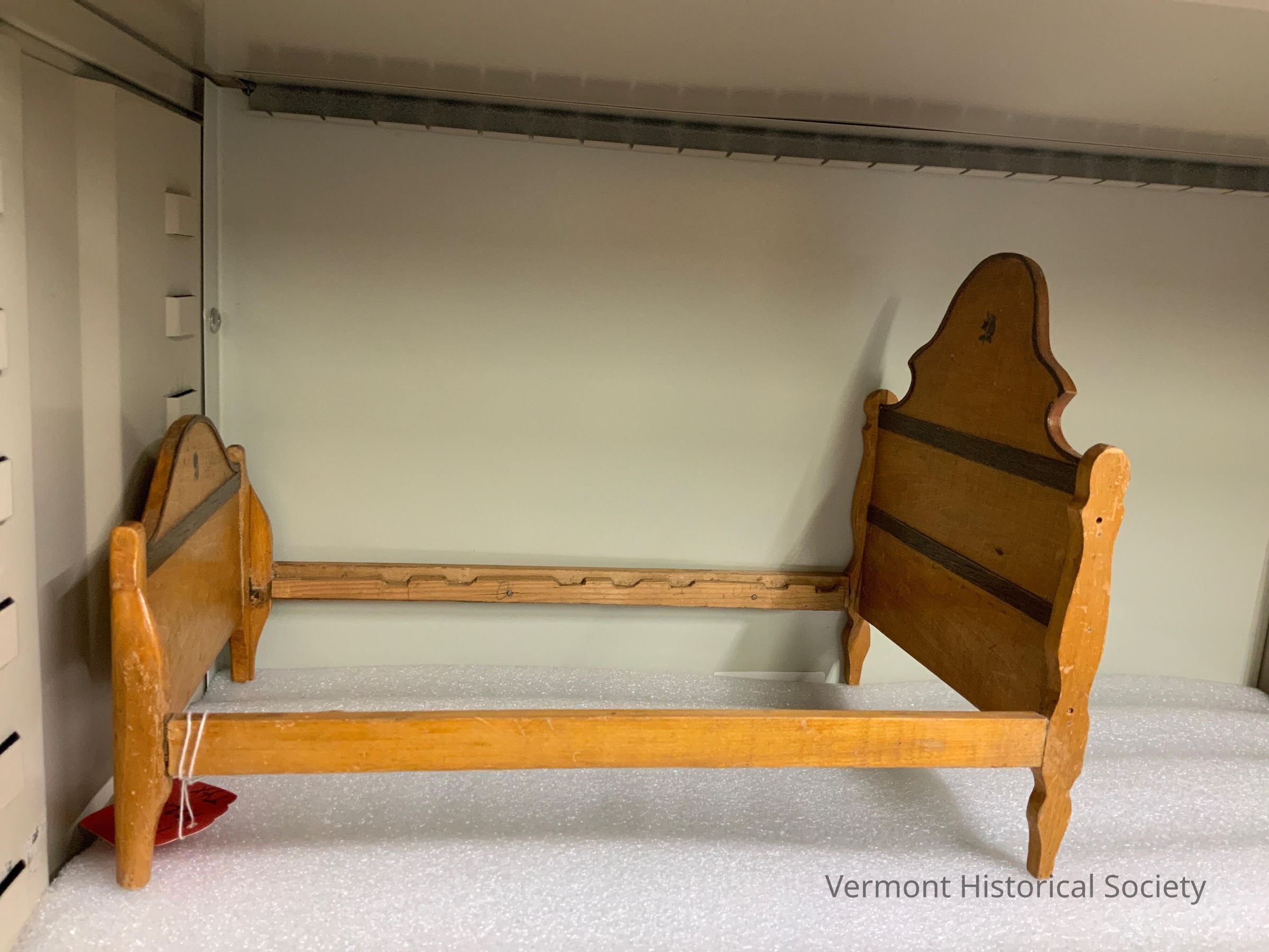 Miniature wooden bedstead sized for a doll. The bedstead consists of a headboard, footboard, and siderails. The siderails are notched on the inner sides to hold rails (not present). The headboard has a bell-shaped top and is decorated with two horizontal stripes and a small flower. The footboard is arched and decorated with a horizontal stripe and a small flower.Context