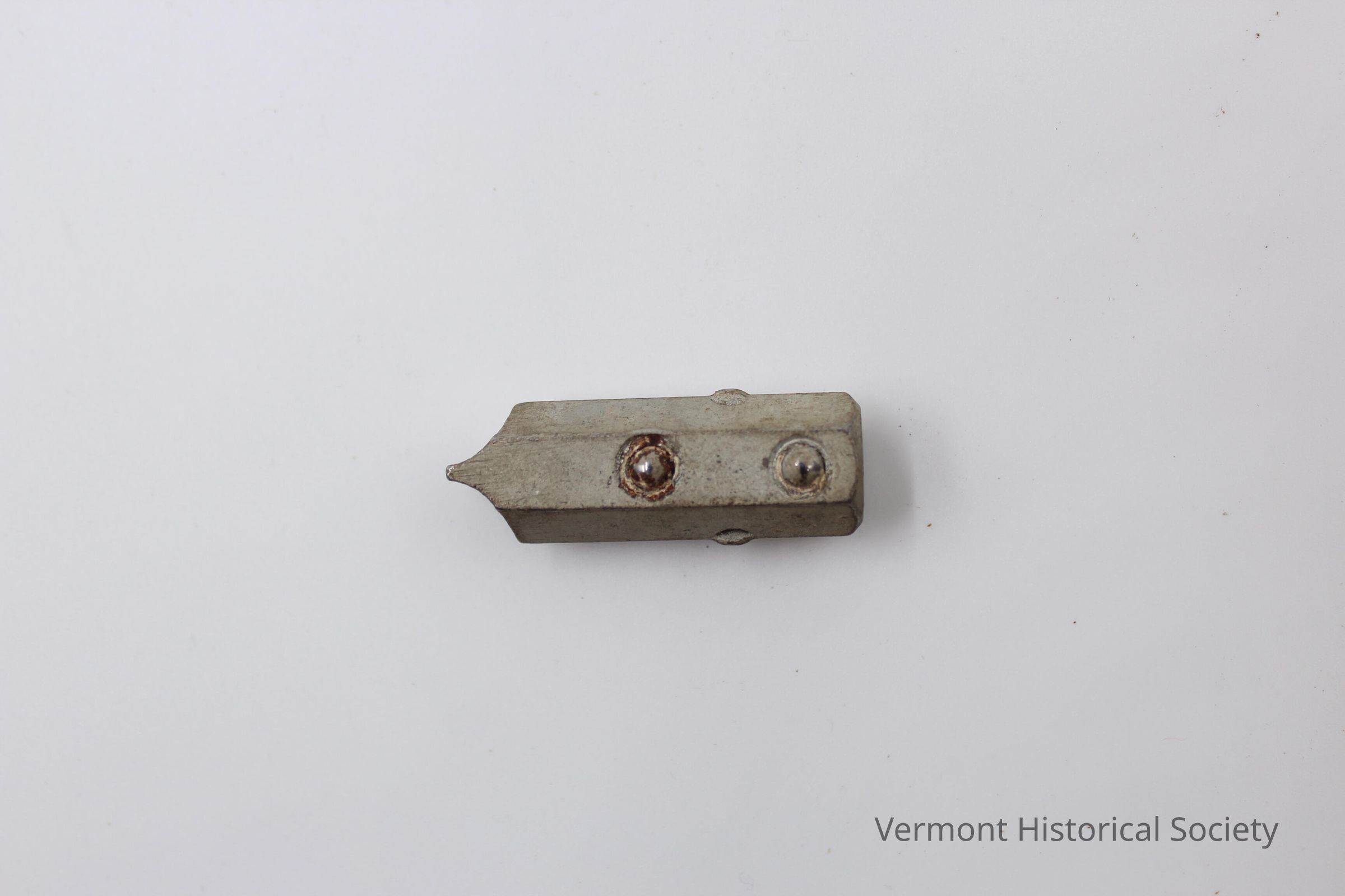 Metal tip, use unknown. It is 5-sided and tapers into a straight point that is flat (similar to the head of a screwdriver). There are two protrusions on one side, possibly to attach it to a handle.Context