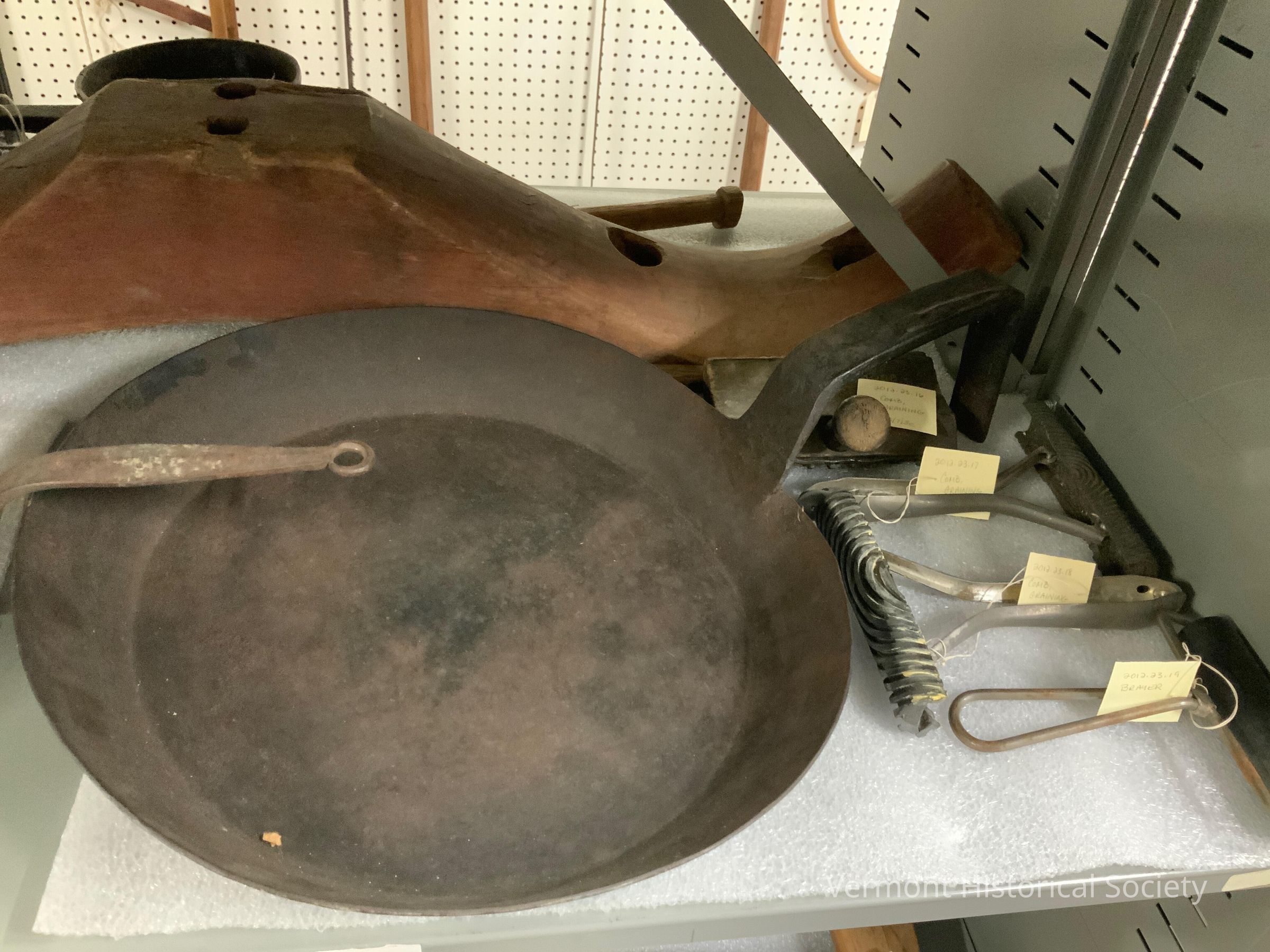 Iron frying pan with applied handle. The round pan has a flat base and angled, hand-shaped sides with a slightly irregular top edge. The attached handle is made from a second piece of iron and has squared edges. The handle is upturned at the same angle as the sides, then is bent to be horizontal, before angling sharply down to create a hook-like end for storing.