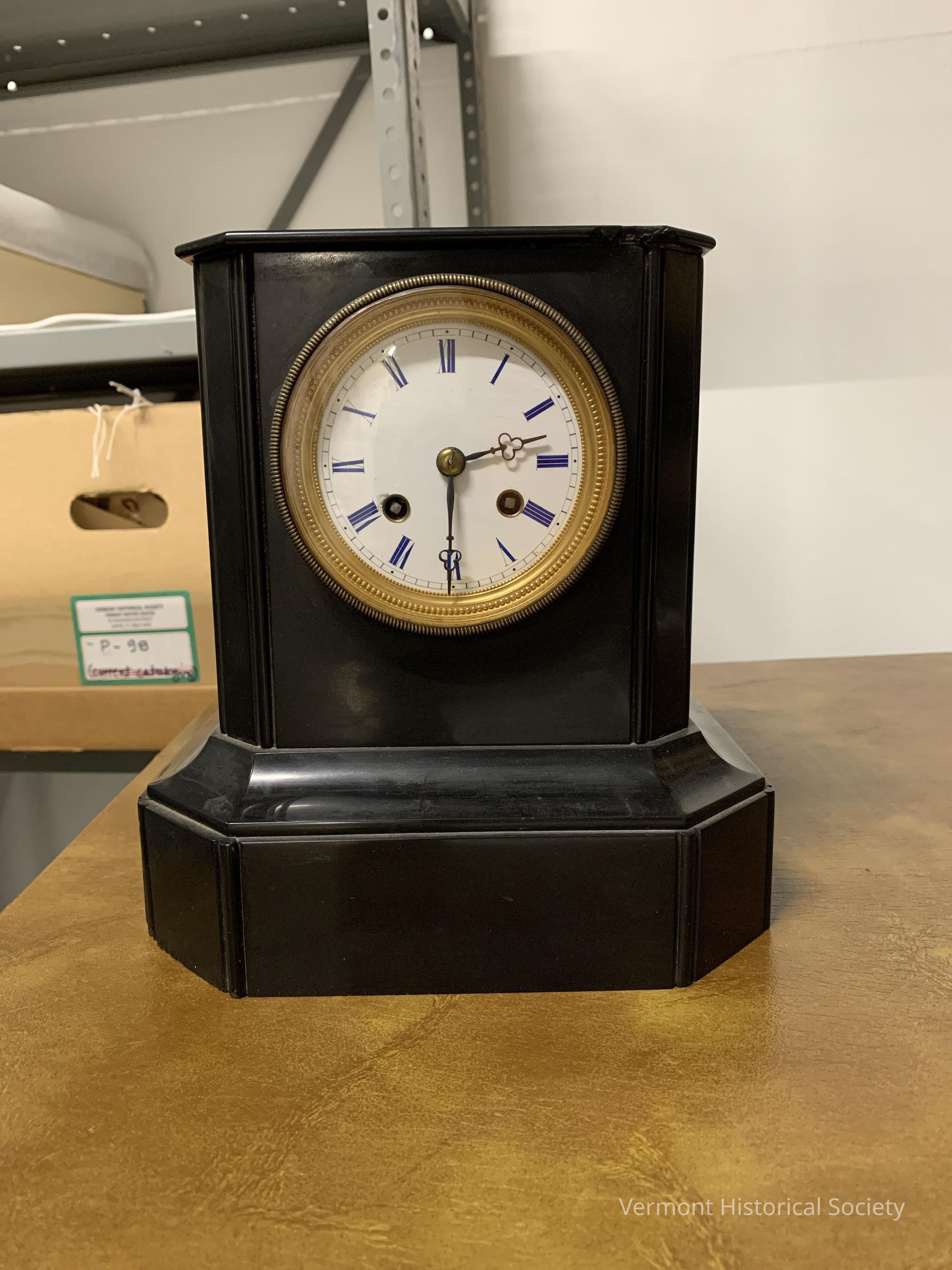 Black wooden mantel clock. The body of the clock is square with cut of corners. It has an inset, round face framed in brass with a glass front.Context