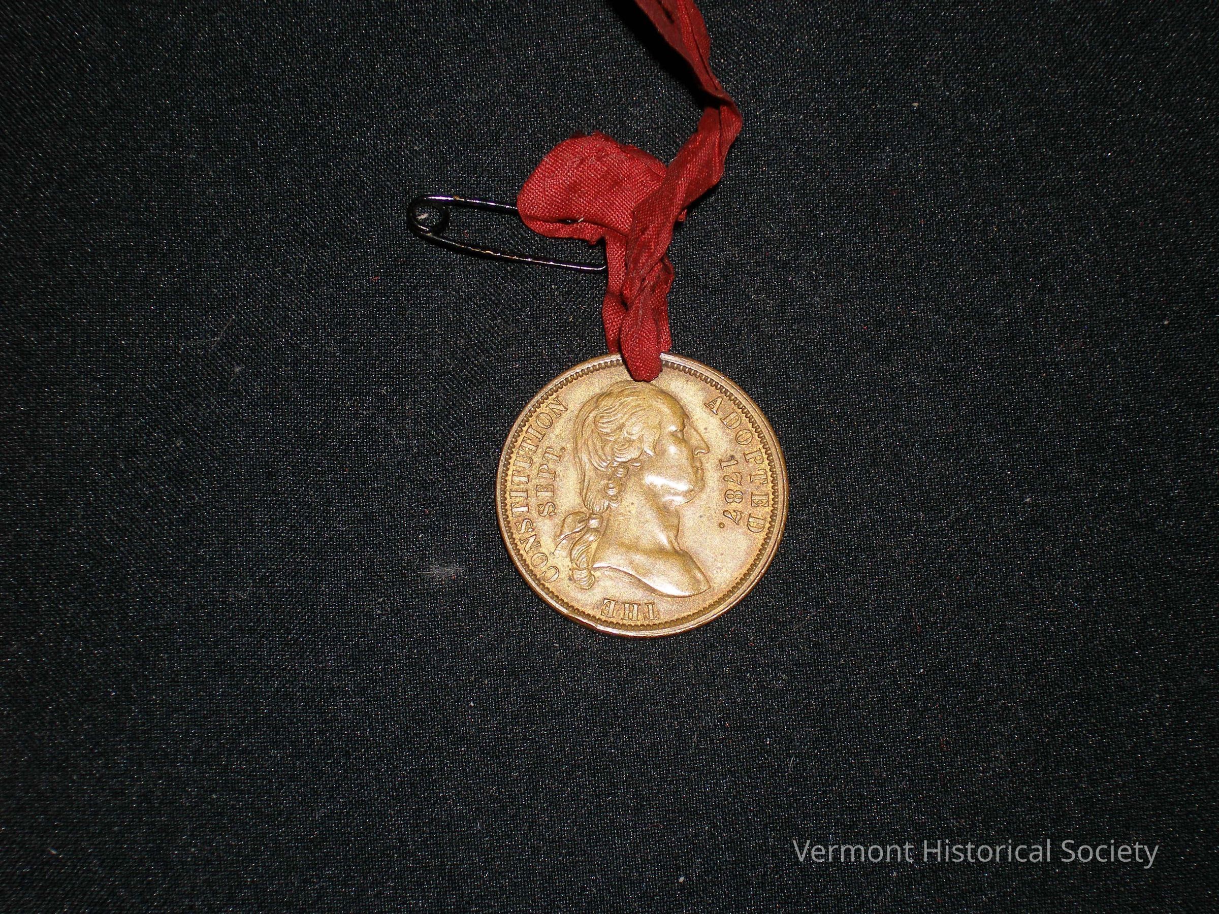 Small round medal with a profile bust of George Washington on one side and a bust of Grover Cleveland on the other. The Washington side bears the inscription, "THE CONSTITUTION ADOPTED SEPT. 1787". The Cleveland side bears the inscription, "CONSITUTION CENTENNIAL SEPT. 1887". There is a hole at the center top of the medal through which a red silk ribbon has been tied. A black safety pin is attached to the ribbon.Context