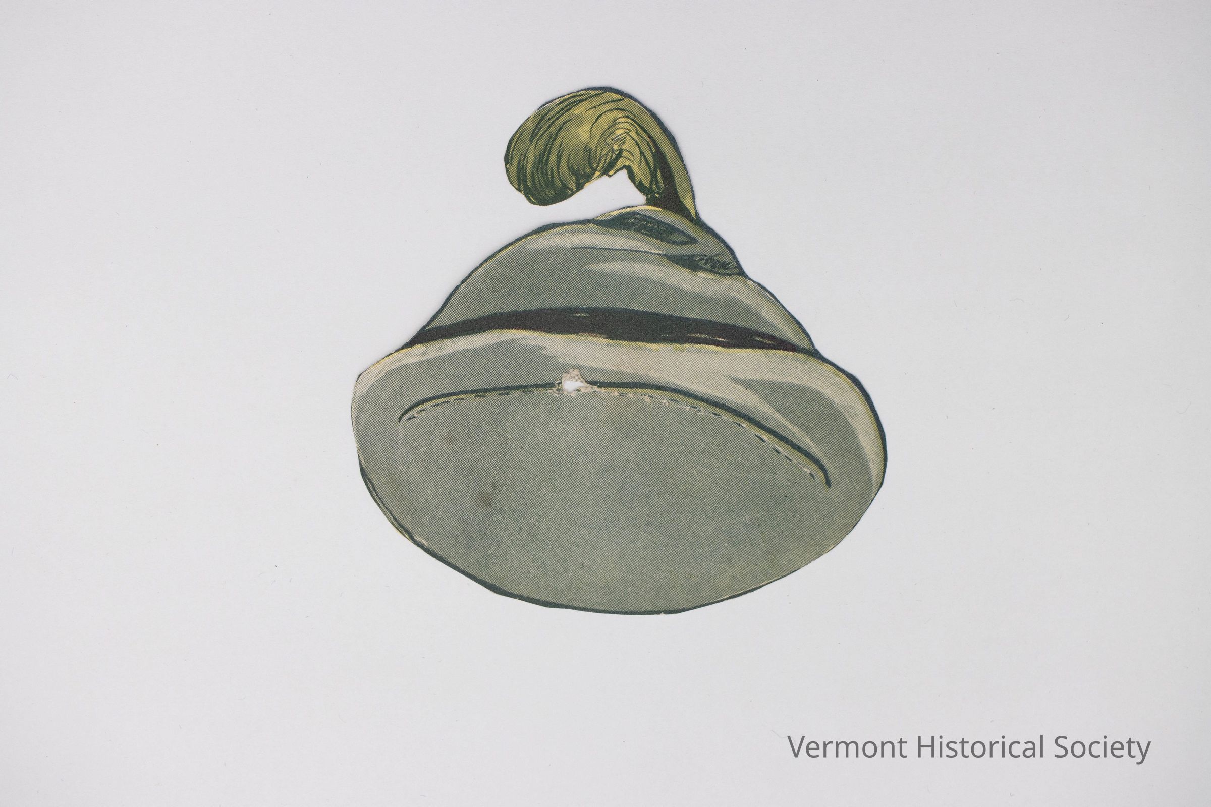 Green, printed paper hat for a paper doll decorated with a green feather at the top center. The back shows a portion of a sales catalog page.Context