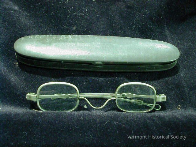 Metal framed eyeglasses with clear rectangular lenses. The temples extend outward with a pin-and-slot. They are accompanied by a metal eyeglass case. The case hinges open along one of the long edges.