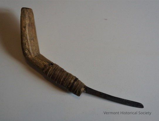 This mid-late 19th century crooked knife is the only one Wiseman has seen in the Abenaki area with a rawhide-wrapped handle. The handle is of softwood. Other than that, it is a typical example of a native-made tool used for making basket handles, snowshoes, axe handles and many other items.Acquisition