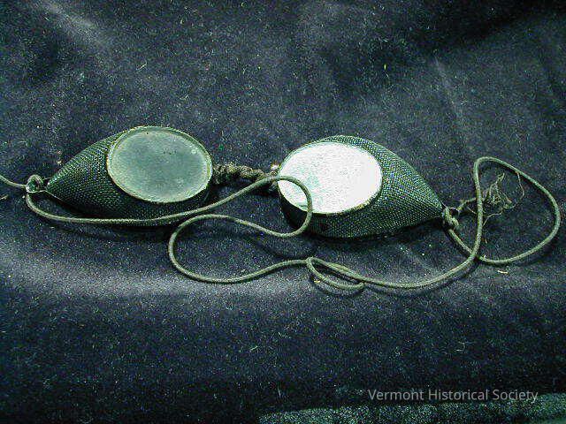 Safety goggles consisting of oval, clear glass lenses surrounded by shaped, metal mesh cage-like frames. Each lens is framed separately and connected with a bridge made of thick, twisted twine. They secure to the wearer's head with a length of elastic attached to the outer point of each frame.Context