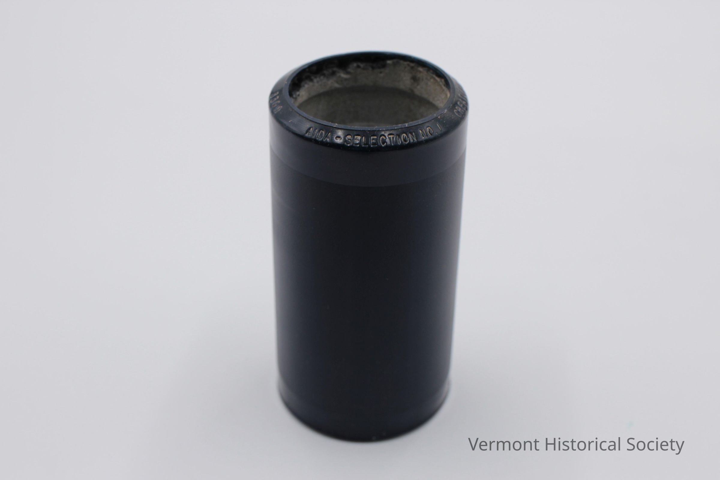 Black phonograph cylinder with a cardboard case. The cylinder, or "record", is a hollow cylinder consisting of hard, blue, ridged celluloid around a concrete core. One edge of the cylinder is labeled in white with the words, "3309 AIDA-SELECTION NO. 1 CREATORE & HIS BAND / Thomas A Edison PAT'D. 24."Use
