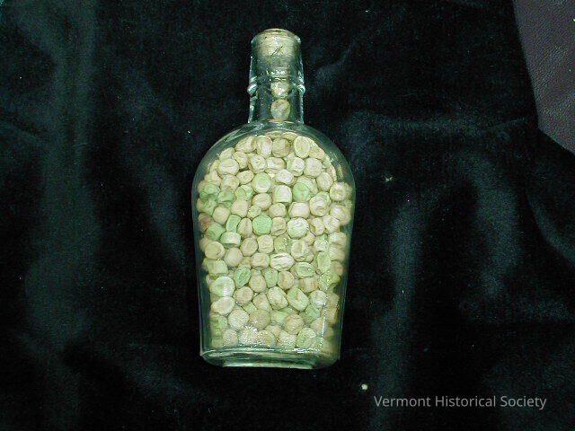 Dried peas in a glass bottle. The bottle has a rounded body that flares out from a short neck that has been stopped by a cork. The peas are shades of pale green and brown.