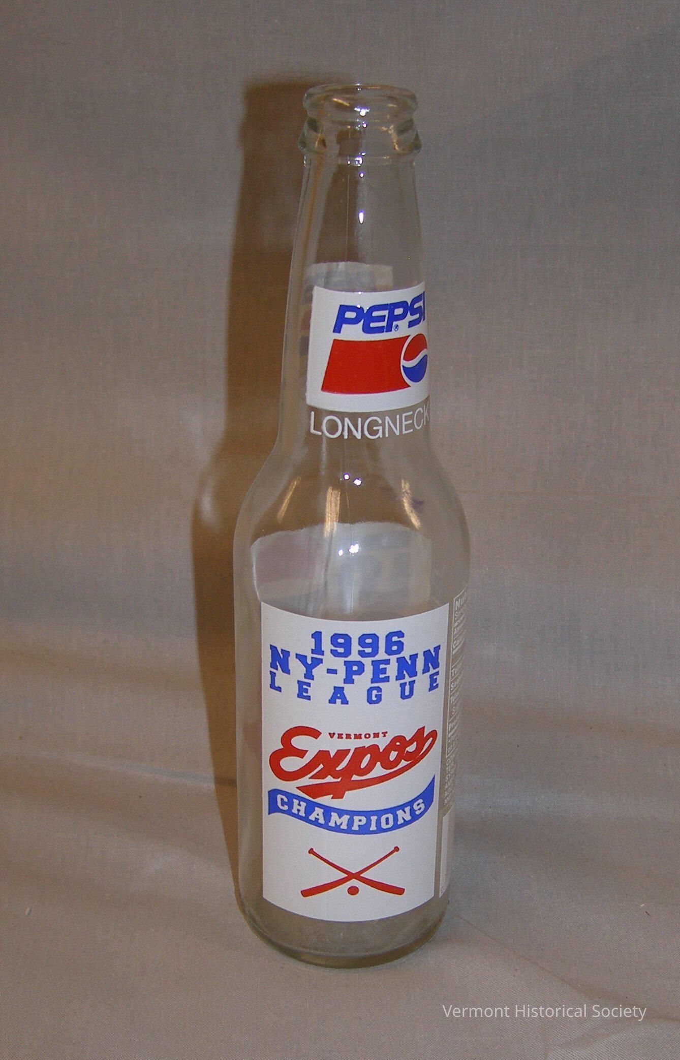 A "longneck" 12-oz. soda bottle from Pepsi. One side panel reads: "1996 NY-PENN/LEAGUE/VERMONT/Expos/CHAMPIONS" Stamped with "REFUND 5c CT-NY/MA-VT-ME-DE" Blue ink near "shoulder" of bottle "MAR 09 99( blurred)/ 1234BV060497"