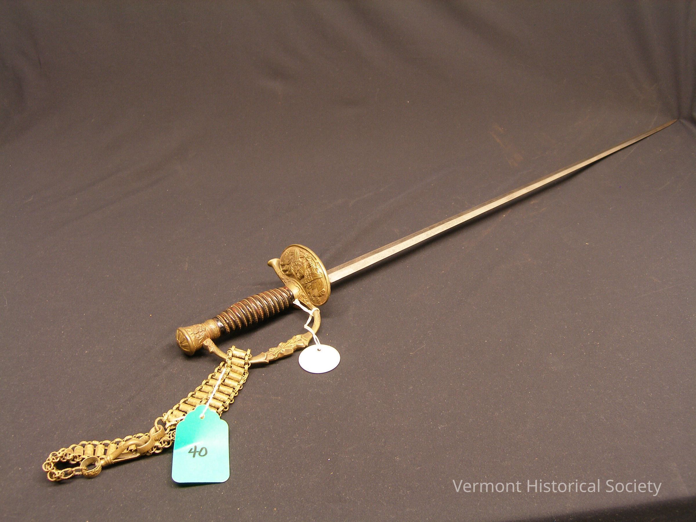 Straight-bladed sword with silver scabbard. The grip is leather wrapped with twisted bronze wire. The guard and pommel is molded into a design of eagles, shields, and crossed guns. There is a wide chain hanging from the knuckle guard. The scabbard in engraved with the inscription, "Presented to Capt. A. G. Robbins 2nd Regt. Vt. Vols. by the Officers July 4th 1863".Context