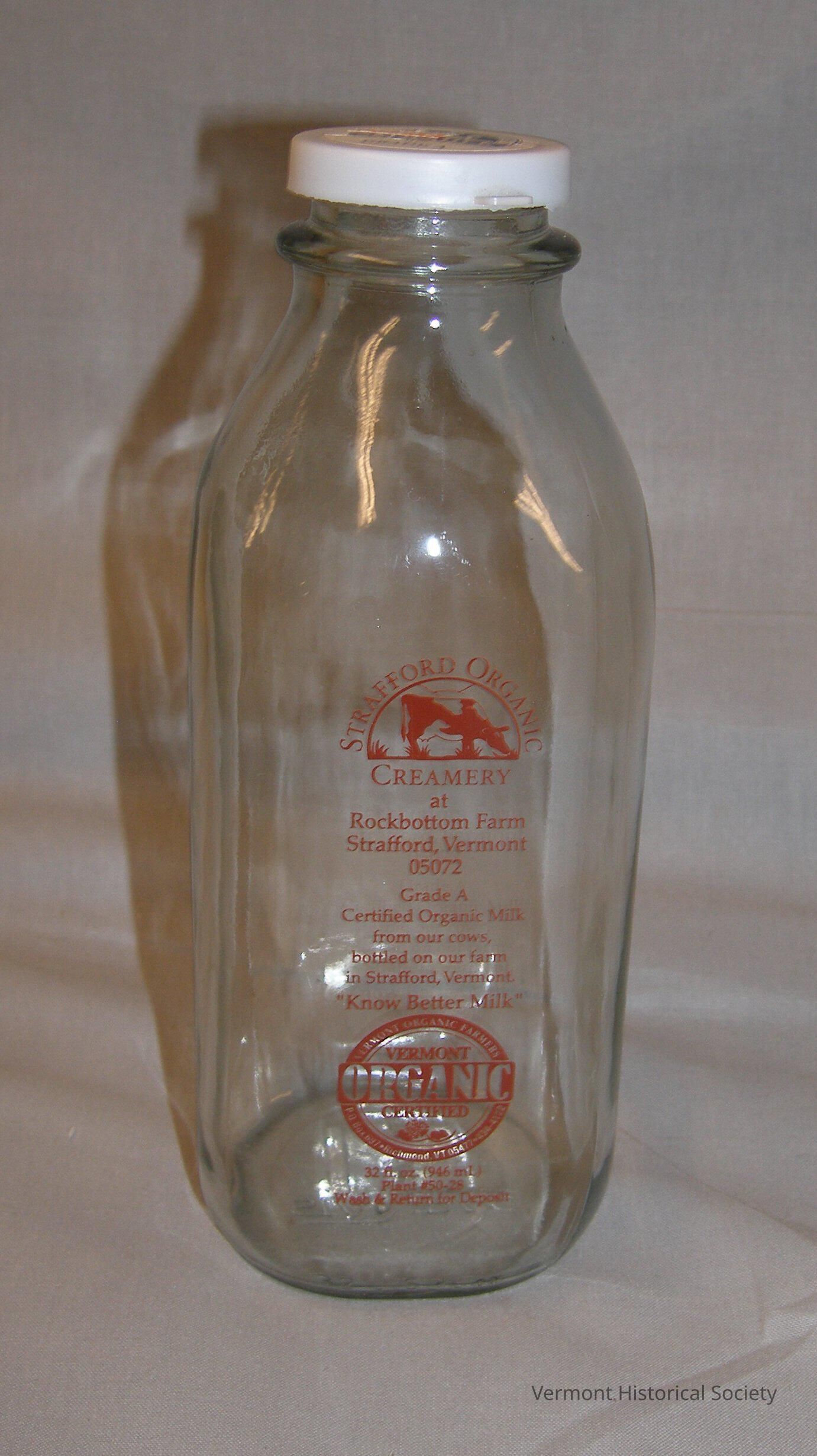 b= 32 fl. oz. bottle has imprinted on one side in dark red lettering "STAFFORD ORGANIC CREAMERY at Rockbottom Farm, Stafford, Vermont 05072/ Grade A/ Certified Organic Milk/ from our cows,/ bottled on our farm/ in Strafford, Vermont./ 'Know Better Milk'" Below is seal of "Vermont Organic Certified", 32 fl. oz/ Plant # 50-28" and at bottom: "Wash & Return for Deposit"Acquisition