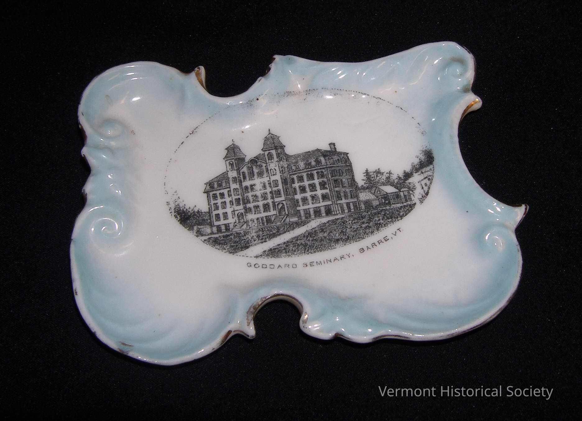 White porcelain card receiver with asymmetrical, rococo style edge. The center is printed with an engraved illustration of a large institutional building. The image is labeled, "GODDARD SEMINARY, BARRE, VT". The reverse is marked, "Made in Germany for G. F. SCOTT & CO BARRE, VT."Context