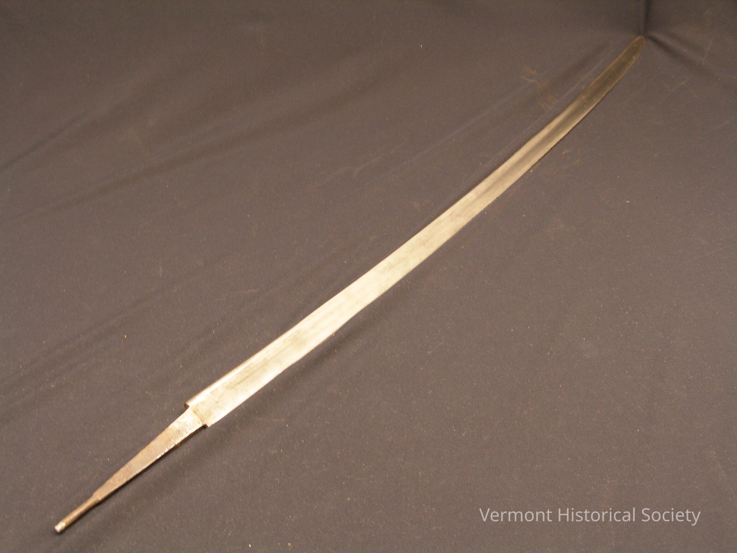 A sword blade with scabbard. The hilt and grip of the sword are missing, leaving only the blade and exposed tang. The blade is marked, "w", and the tang is marked, "2 L". The scabbard is steel with two attached rings.