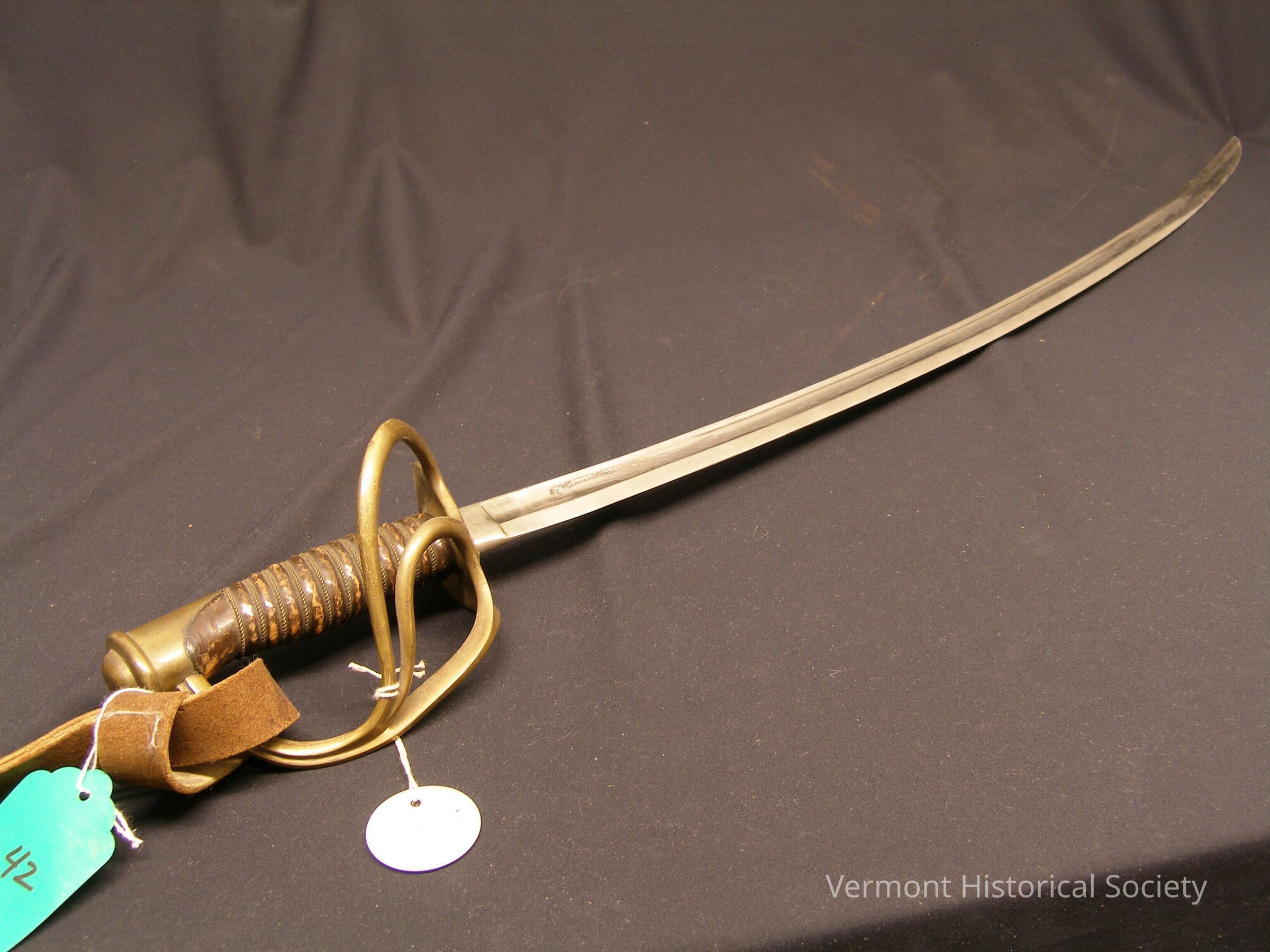 Saber with steel scabbard. The grip is brown leather wrapped with gold-toned twisted wire. The bronze guard and pommel are unengraved. The blade is stamped with the mark, "J.B.A."