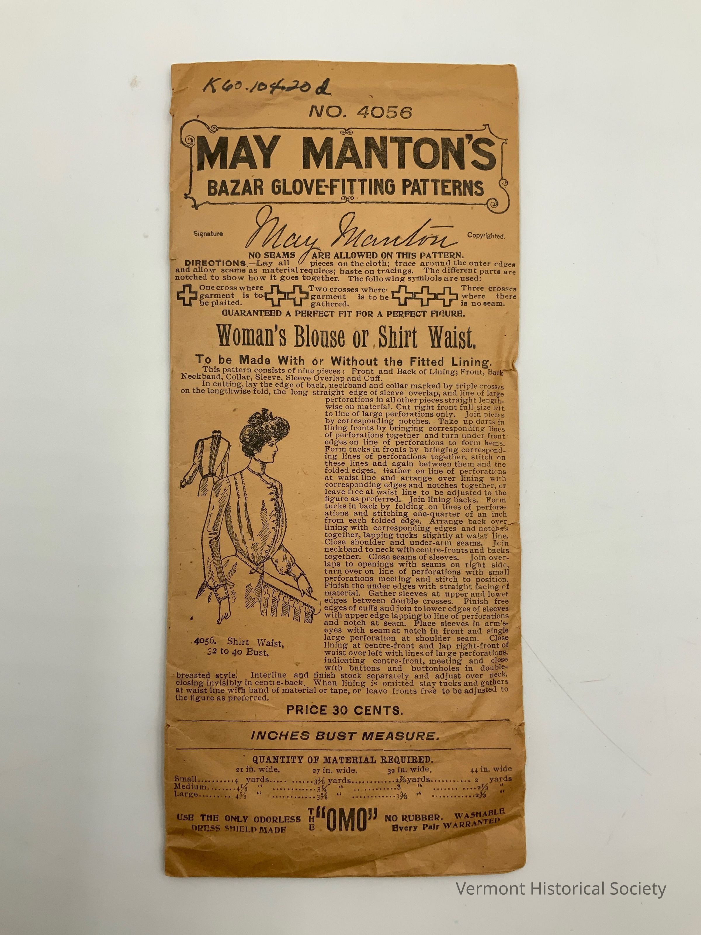 Cut tissue paper sewing pattern in a commercial envelope. The front of the envelope is printed with brand information ("MAY MANTON'S BAZAR GLOVE-FITTING PATTERNS"), sewing instructions, and an illustration of the finished garment. The garment is a blouse with an off-center front opening, long sleeves, and high collar ("Woman's Blouse or Shirt Waist").Context