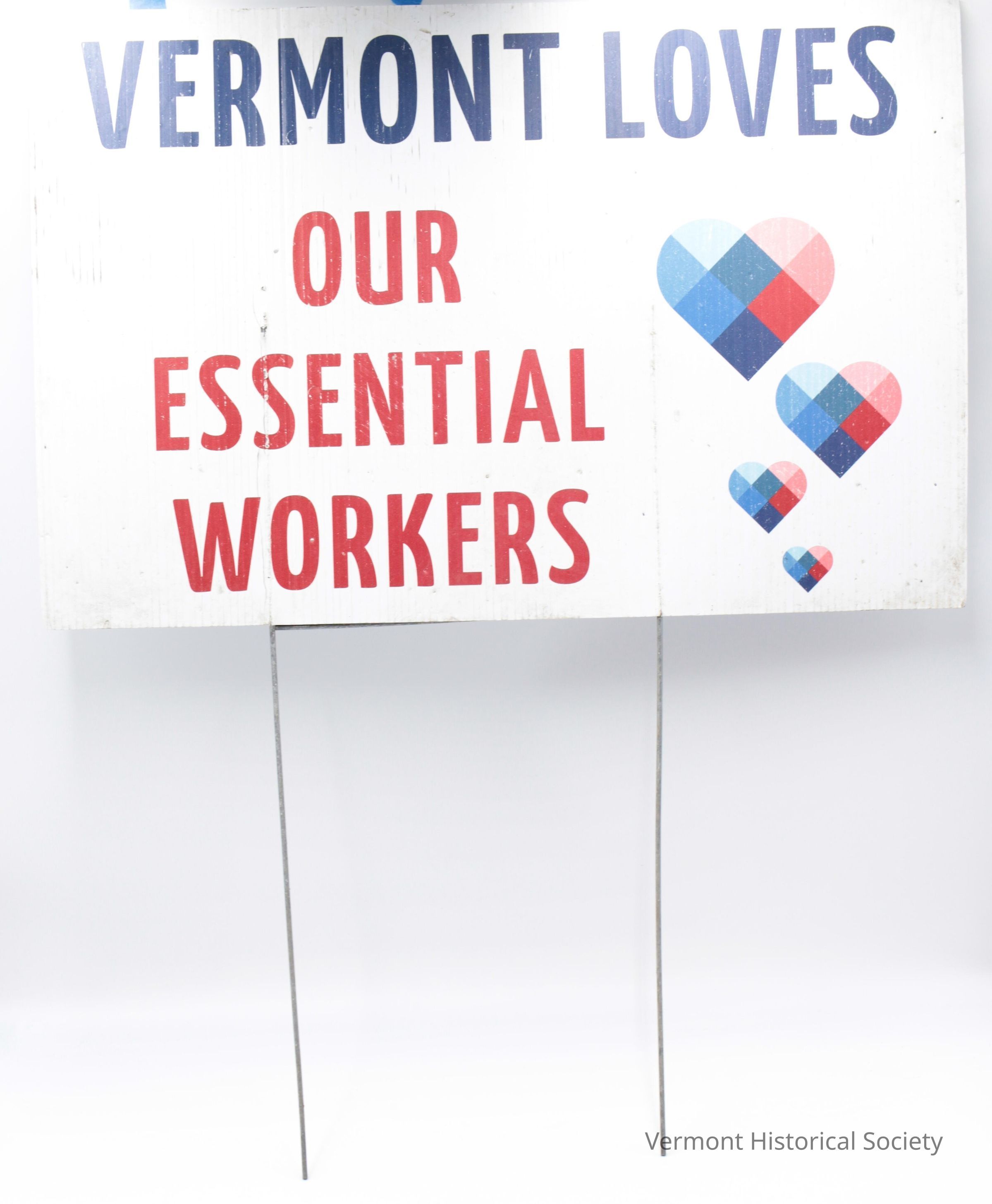 A white yard sign (b) printed on both sides with the words, "VERMONT LOVES OUR ESSENTIAL WORKERS" in blue and red text with four red and blue hearts. There are metal posts (b) attached to the sign to be inserted into soft ground.