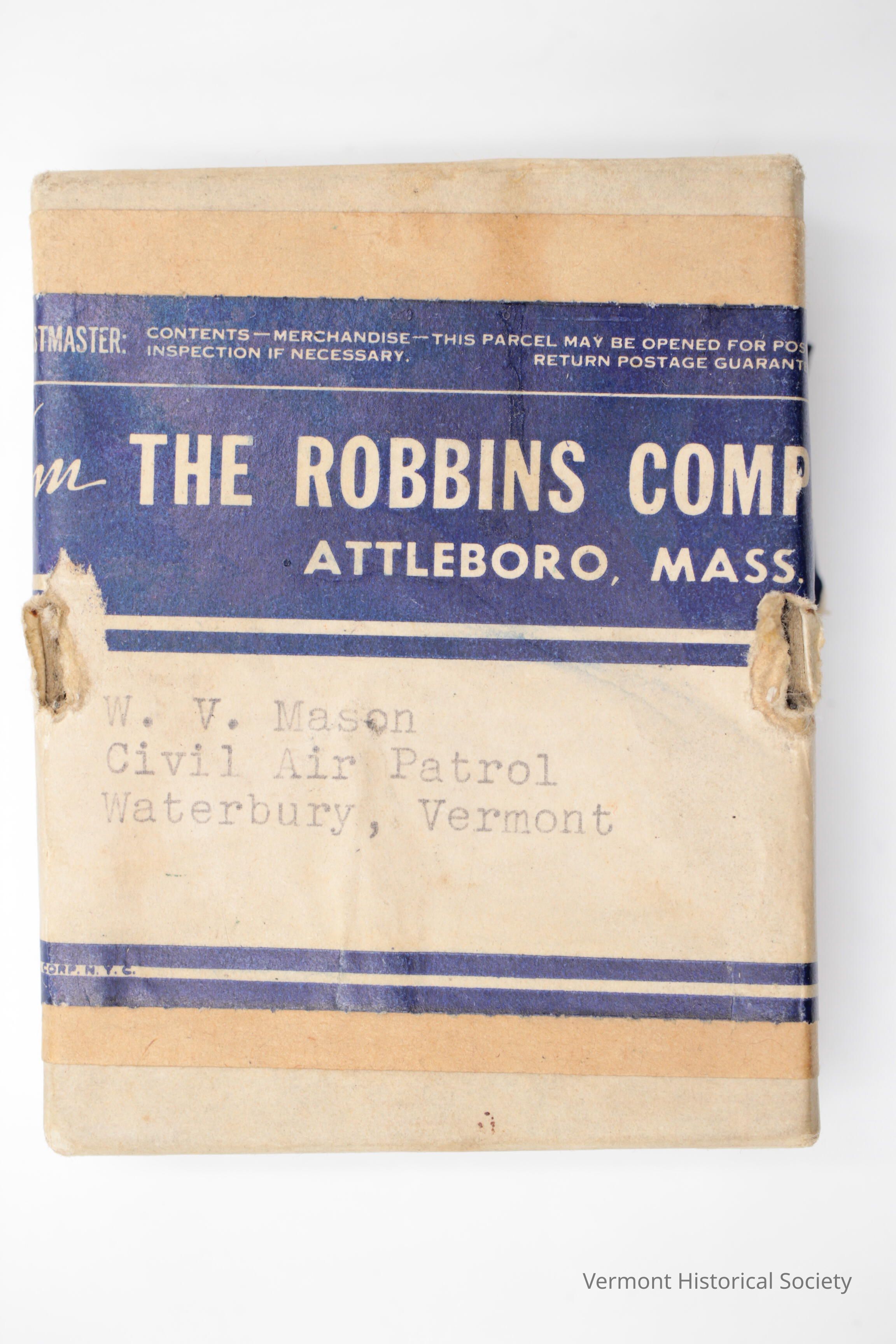 A small, cardboard box with a large paper mailing label. The box is addressed to "W. V. Mason Civil Air Patrol Waterbury, Vermont