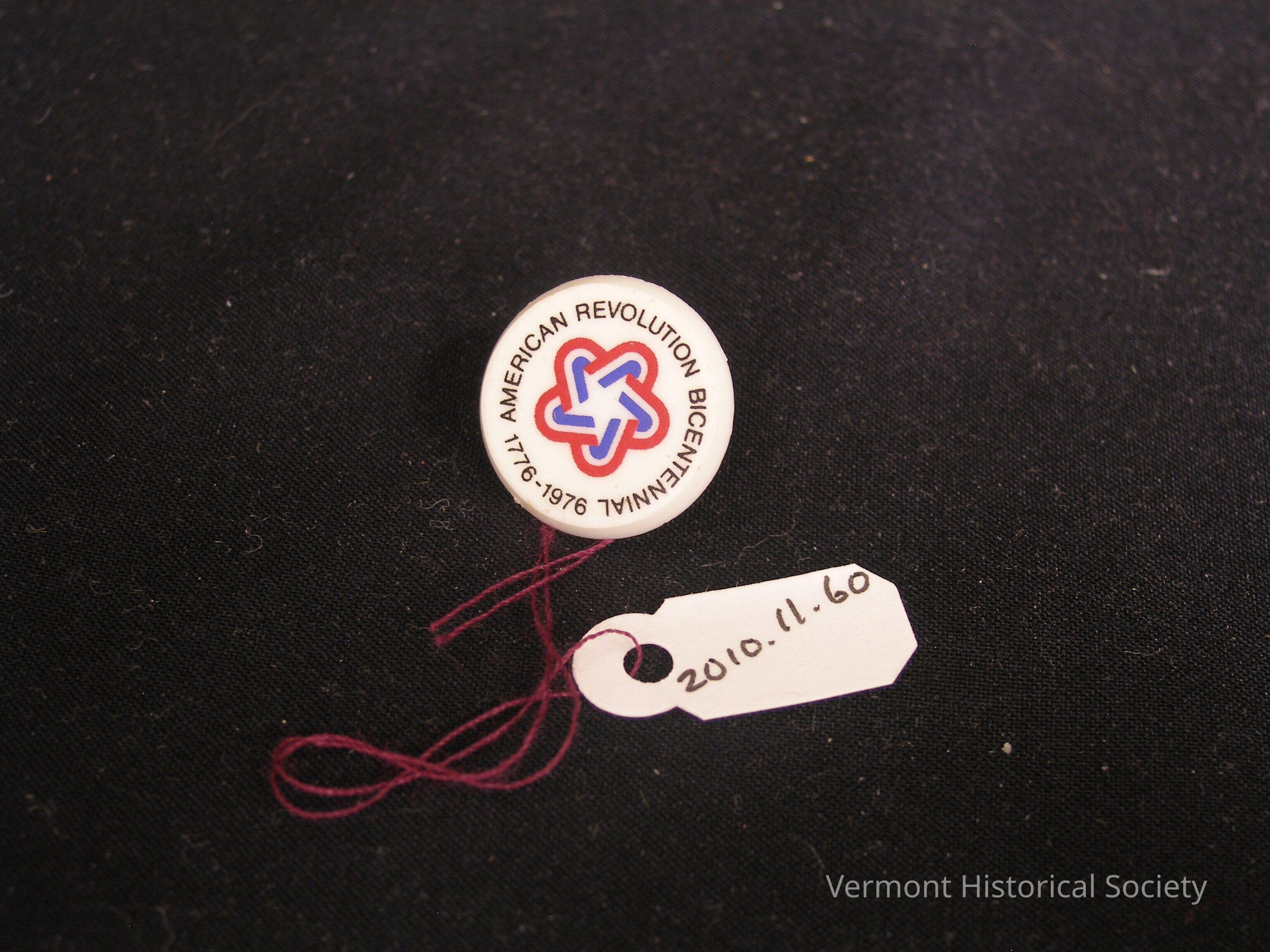 Round white post-backed pin printed with a red, white, and blue rounded star logo and the words, "AMERICAN REVOLUTION BICENTENNIAL 1776-1976".