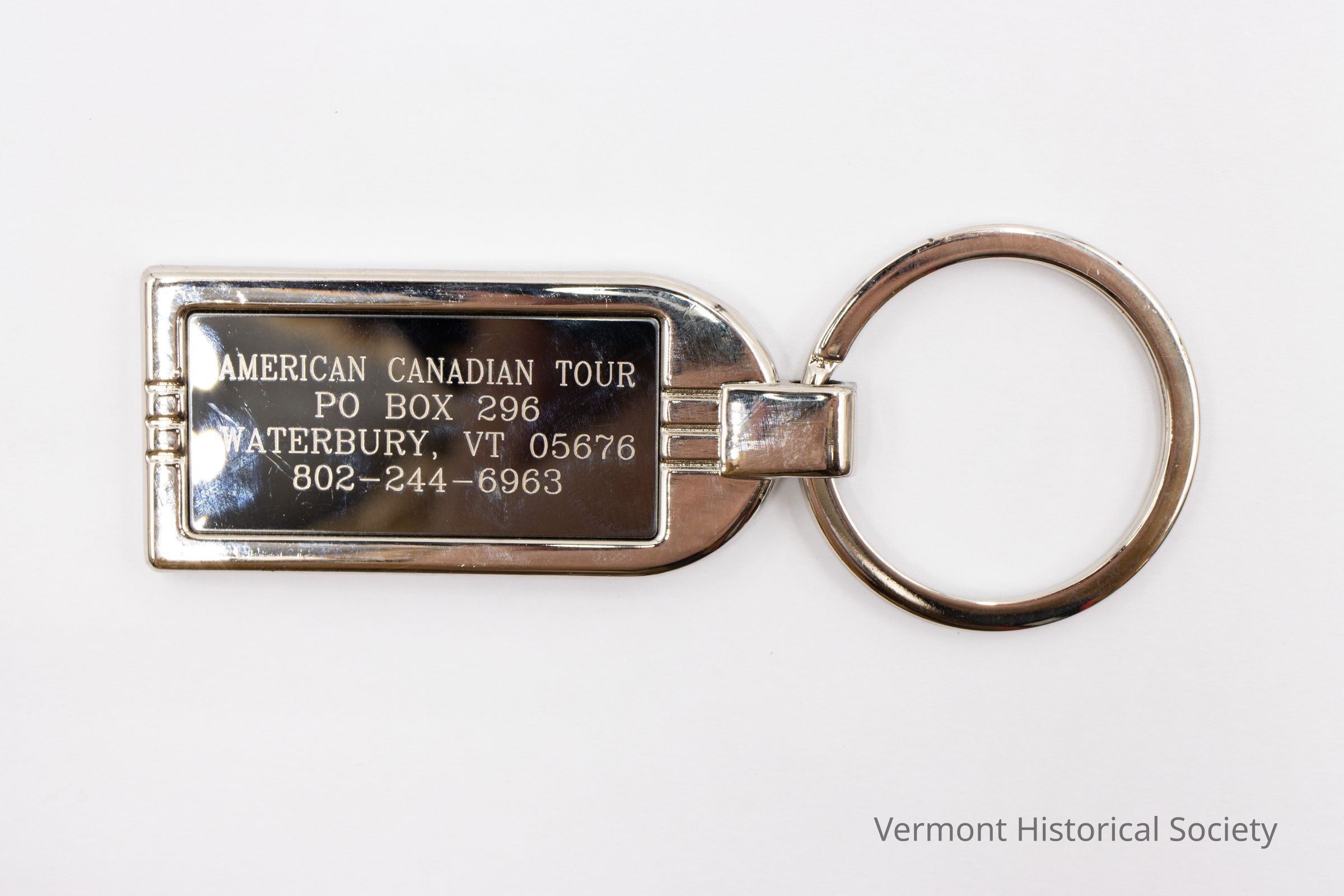 Round metal key ring attached to a rectangular metal tag with one rounded edge. One side of the tag has an etched metal insert that reads, "AMERICAN CANADIAN TOUR / PO BOX 296 / WATERBURY, VT 05676 / 802-244-6963".