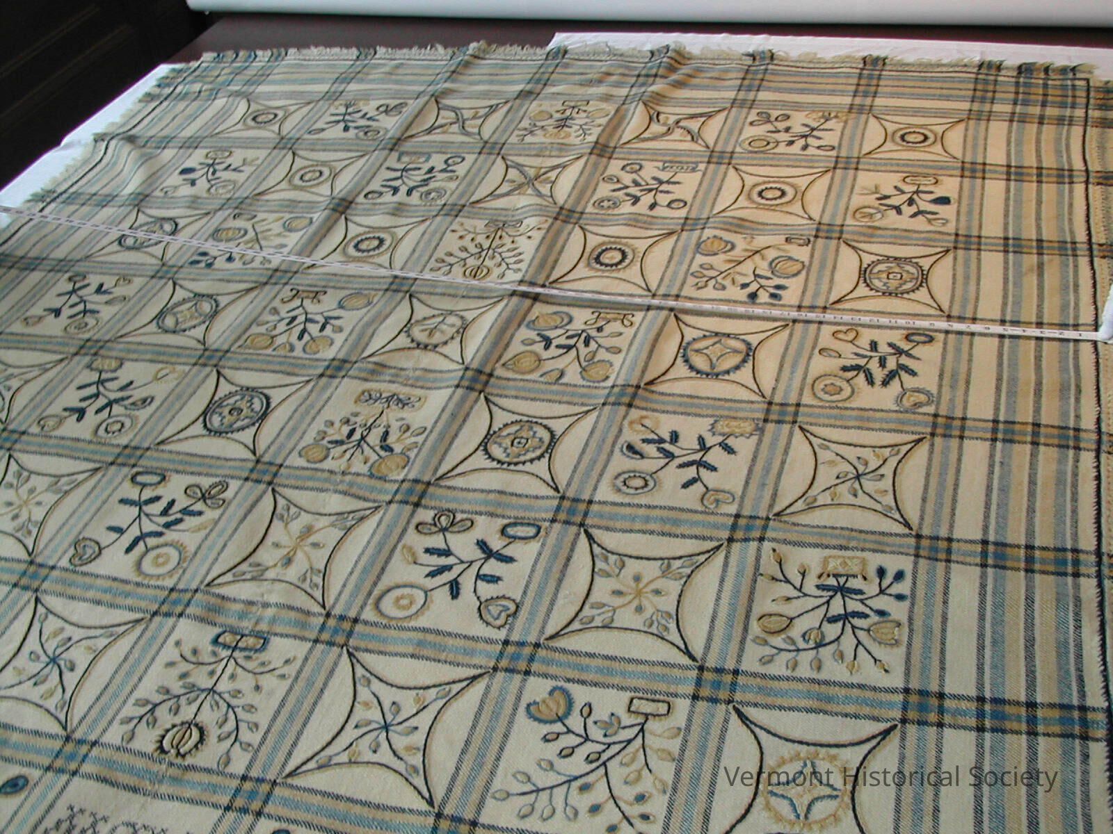 Crewel embroidered counterpane. The ground fabric is plain-woven wool in a windowpane plaid design. The "panes" are white, and the stripes of the plaid are dark blue, yellow, and light blue. All four edges of the counterpane are bordered in widened version of the multi-colored stripe. Each pane is crewel embroidered with wool yarn in dark blue, light blue, yellow and white. The designed alternate between four-pointed stars with floral vines or medallions in the center and floral bouquets. One pane is marked with the initials ABW in cross stitches.Context