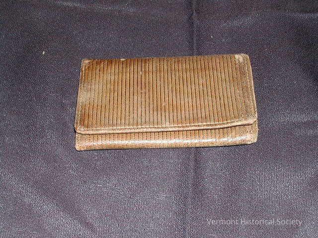 Striped leather trifold wallet. It opens to show 3 interior pockets, one of which is printed with the label, "Capitol City Press". Inside one of the pockets are 5 calling cards printed with the name "Mr. Dorman B. E. Kent".