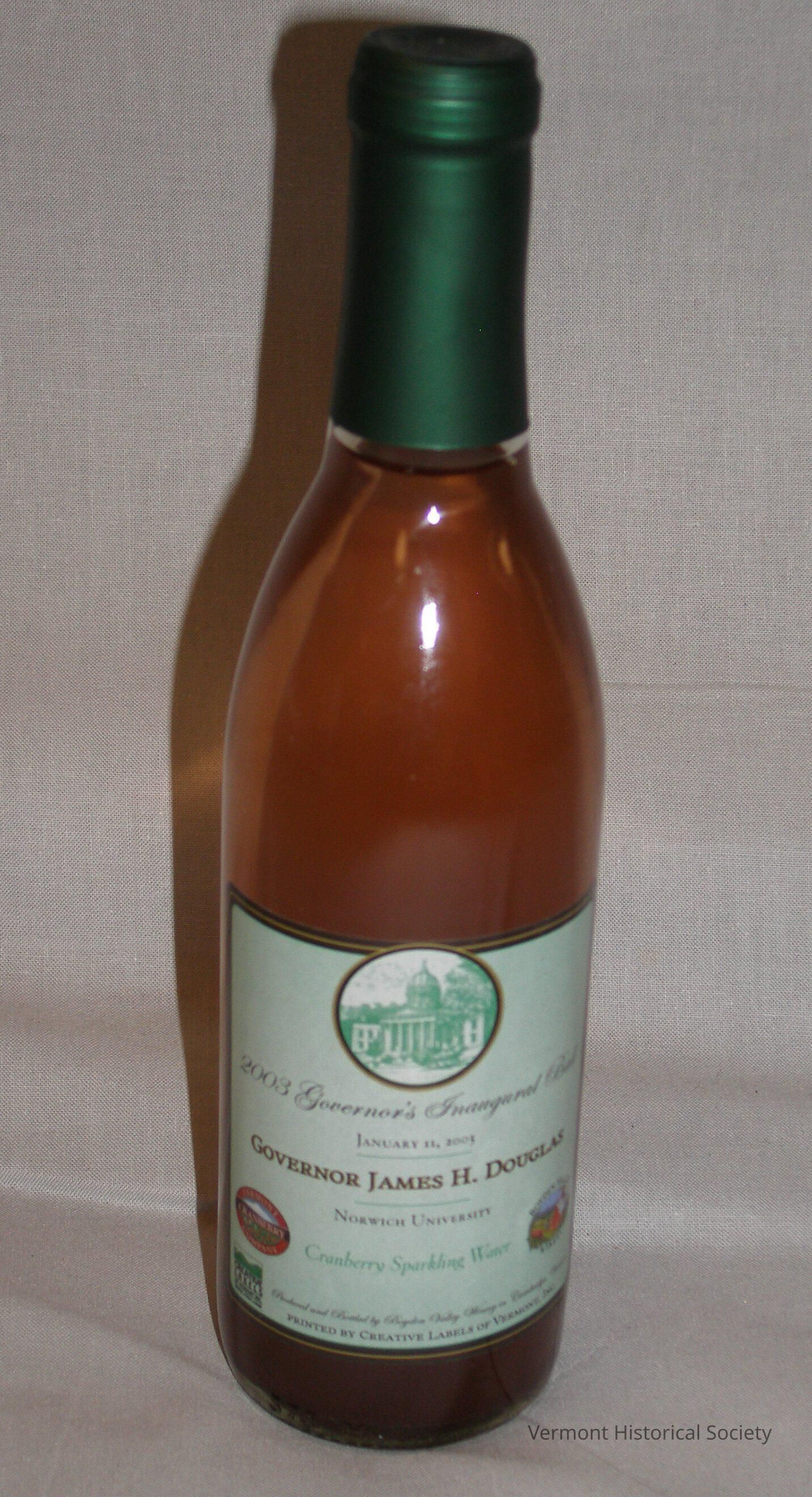 Bottle of cranberry sparkling water produced by Vermont Cranberry Company of E. Fairfield, VT and Boyden Valley Winery, Cambridge, VT, for 2003 Governor's Inaugural Ball. Unique paper label, printed by Creative Labels of Vermont, Inc., features an image of the state house in a circle at top, then "2003 Governor's Inaugural Ball/ January 11, 2003/ Governor James H. Douglas/ Norwich University/ Cranberry Sparkling Water" with logos for Vermont Cranberry Company on left side and Boyden Valley Winery on right side. Bottle is unopened and sealed with green plastic over top and neck.Acquisition