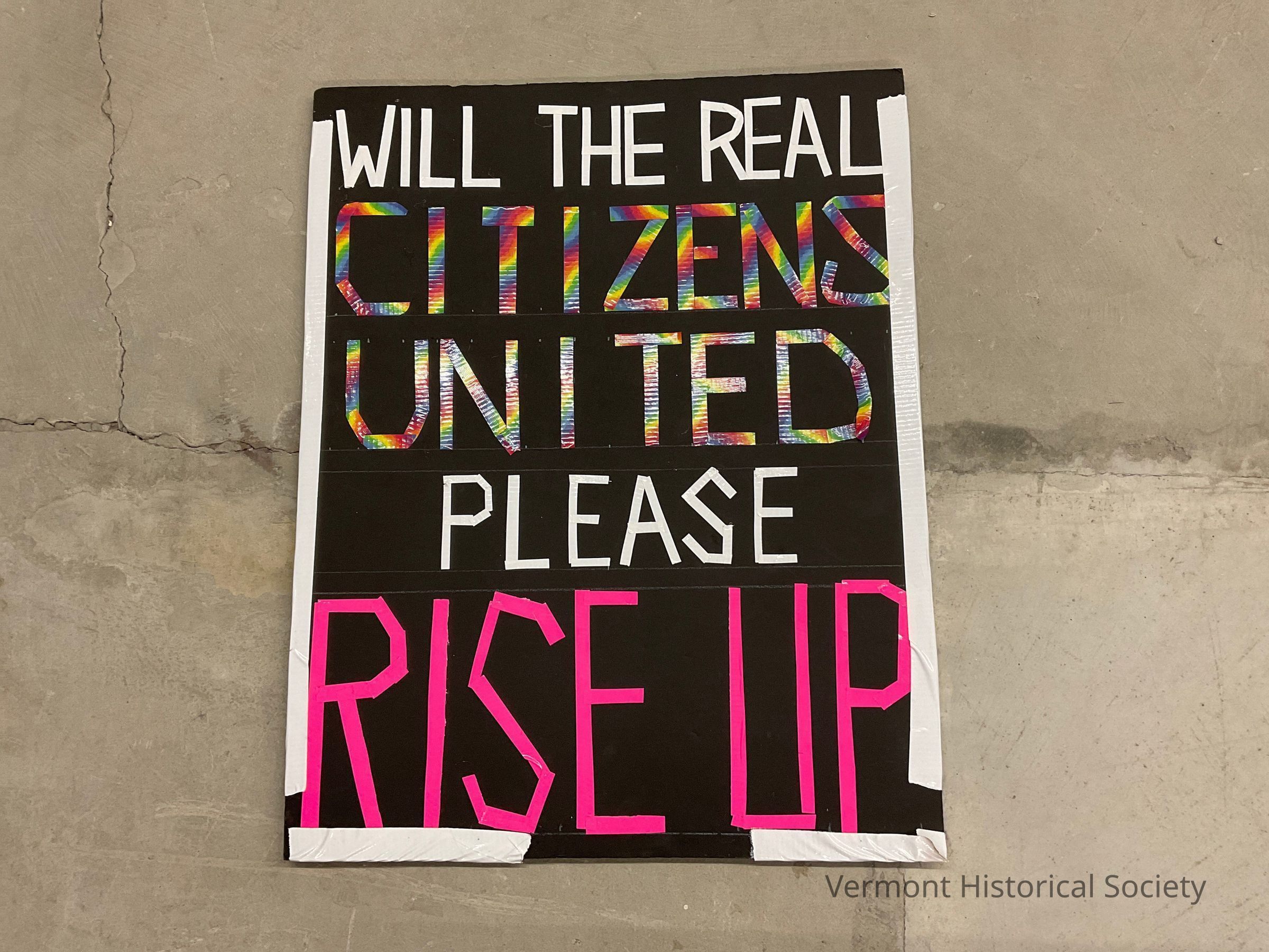 A black, double-sided protest sign. On one side, the words, "WILL THE REAL CITIZENS UNITED PLEASE RISE UP" in multi-colored tape. "WILL THE REAL" and "PLEASE" are both in white tape, "CITIZENS UNITED" is in multi-colored tape, and "RISE UP" is in neon pink tape. On the other side, formed by white tape, reads the words, "HISTORY HAS ITS EYES ON YOU".Context