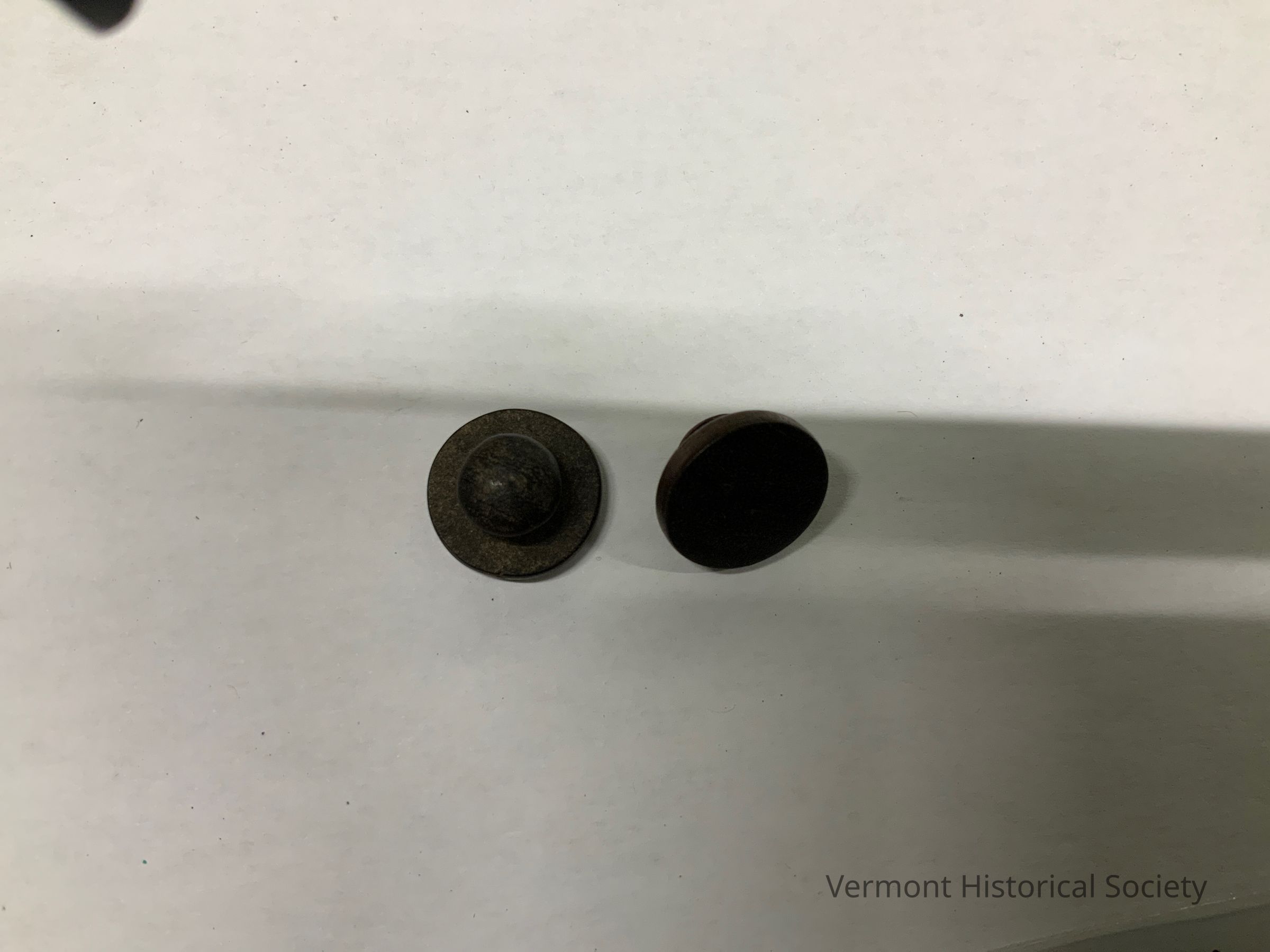 2 round wooden buttons. The buttons have flat faces and knobbed post backs.