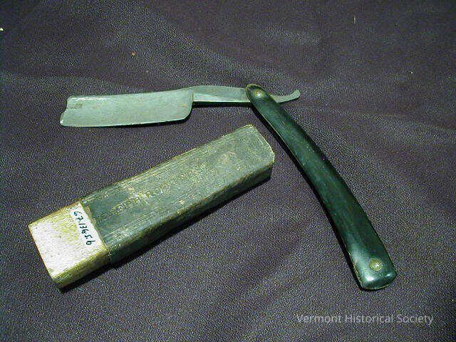 Straight razor whose blade folds down into its black bone handle. It is marked "Wade and Butchers" and "For Barber's Use". It is in a leather-covered cardboard sheath-style box that is marked, "Joseph Rodgers & Sons."