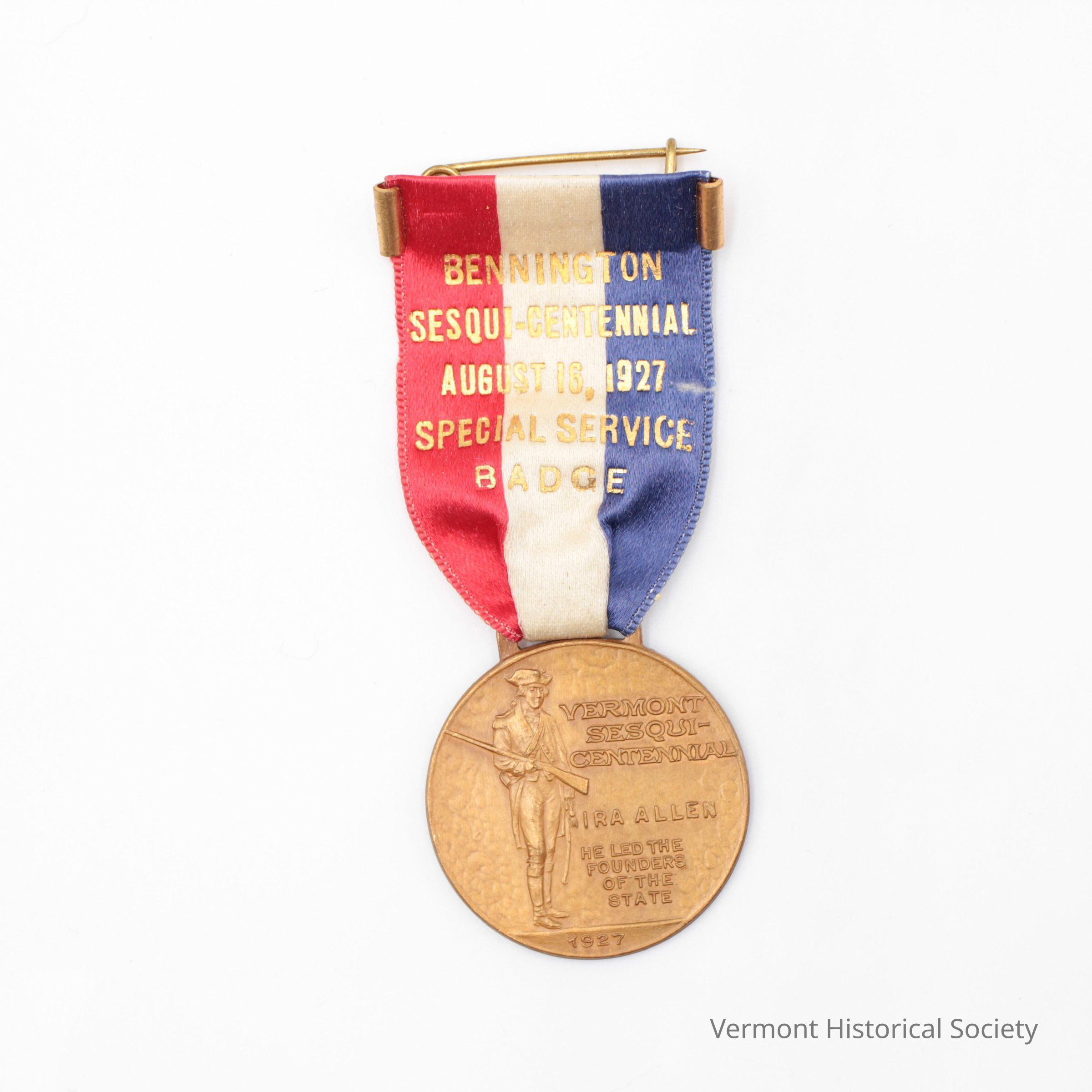 Round, gold medal hanging from a red-white-and-blue striped ribbon. The top of the ribbon is attached to a spring-backed pin. The ribbon is printed in gold with the inscription, "BENNINGTON SESQUI-CENTENNIAL AUGUST 16, 1927 SPECIAL SERVICE BADGE". The front of the medal is molded with an image of a Revolutionary War soldier slouching and holding a long gun in one arm. To his right is the inscription, "VERMONT SESQUICENTENNIAL / IRA ALLEN / HE LED THE FOUNDERS OF THE STATE / 1927". The back of the medal is marked, "THE WHITEHEAD & HOAG CO. NEWARK, N.J." The medal is held onto the ribbon with a metal crimp.Context