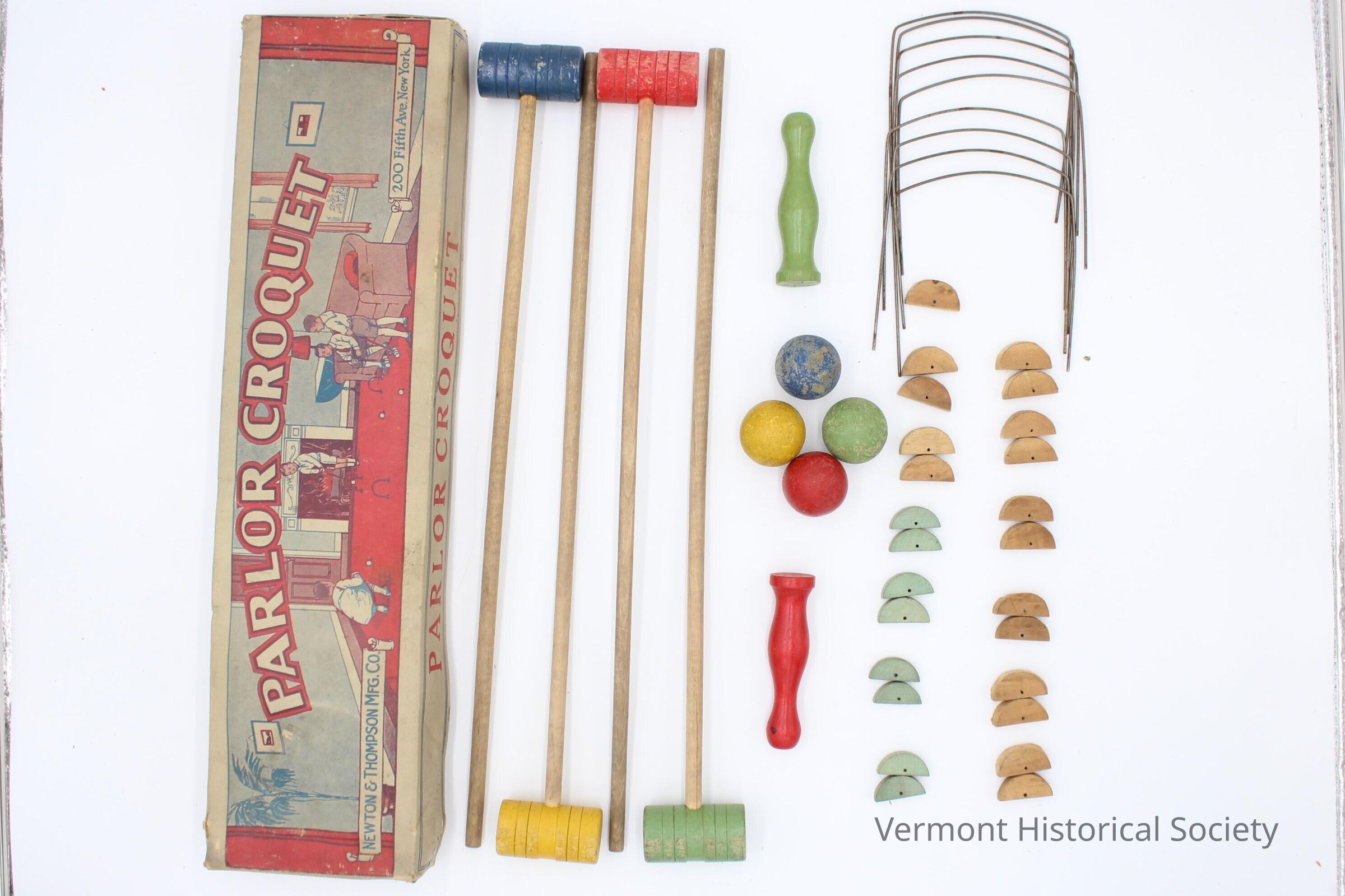 Croquet set consisting of 4 wooden mallets, 4 balls, 2 pegs, 9 hoops, 25 hoop bases (enough for 12.5 hoops), and a cardboard box with lid. The mallets have painted heads (blue, red, yellow, green). The turned wooden balls are painted to correspond with the mallet heads. The pegs are turned and formed with one flat end to be able to rest on a flat surface. They are painted red and green. The hoops are made from wire bent in two places. The bases are semicircular with small holes through the center where the wire can be inserted. 8 of the base pieces are dyed green, and the rest are left unfinished. The box lid is printed with an illustration of children playing croquet in a domestic interior with the inscription, "PARLOR CROQUET" across the top.Context