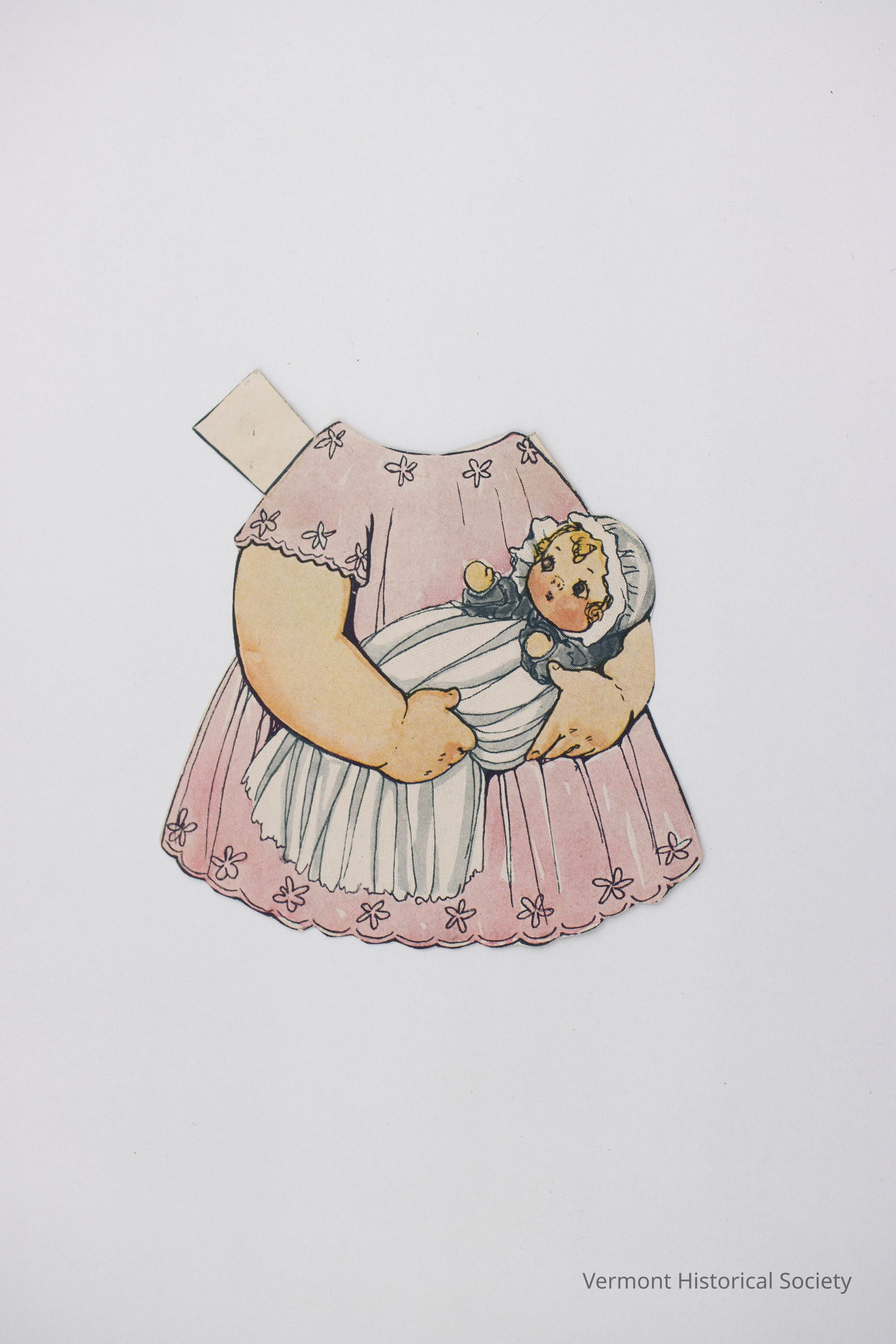 Printed paper dress for a paper doll. The dress is pink with a wide skirt. It shows two orange arms holding a baby in a long white dress. The back shows a portion of a magazine article and the handwritten label, "Cordelia Faro."Context