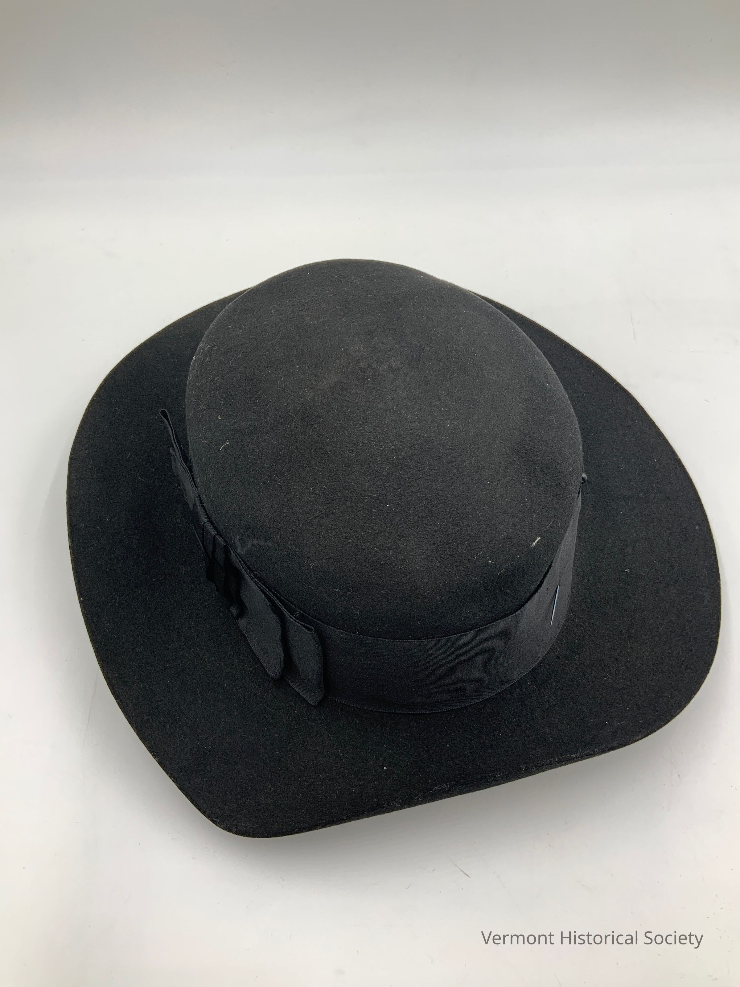 Black felt hat with a round crown and wide brim. The brim is even in width around the entirety of the hat, and one end is curved upward. There is a black grosgrain ribbon around the base of the crown that is folded into a large, decorative bow on one side.Context