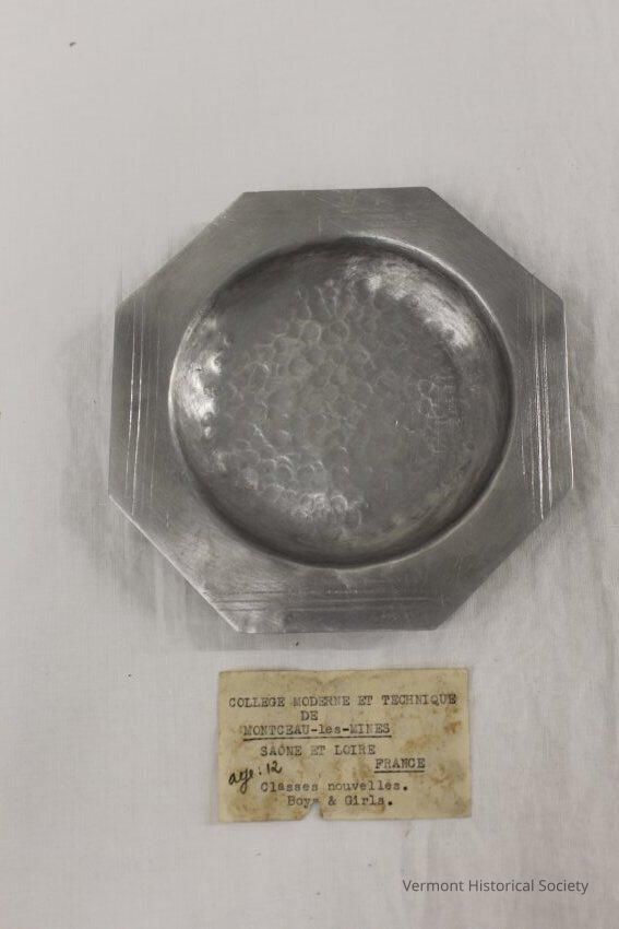 Eight-sided, metal ash tray. A note with it says it was made in a class of boys and girls age 12 at the College Moderne et Technique.Context