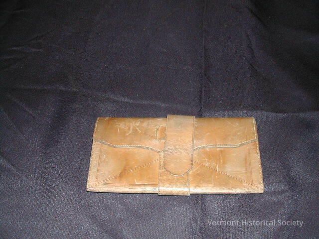 Brown leather trifold wallet. The wallet secures closed with a long leather strap that wraps around the wallet and inserts through a perpendicular leather strap on the front. Inside there are 3 sections: one with a flap to close it and 2 pouches.