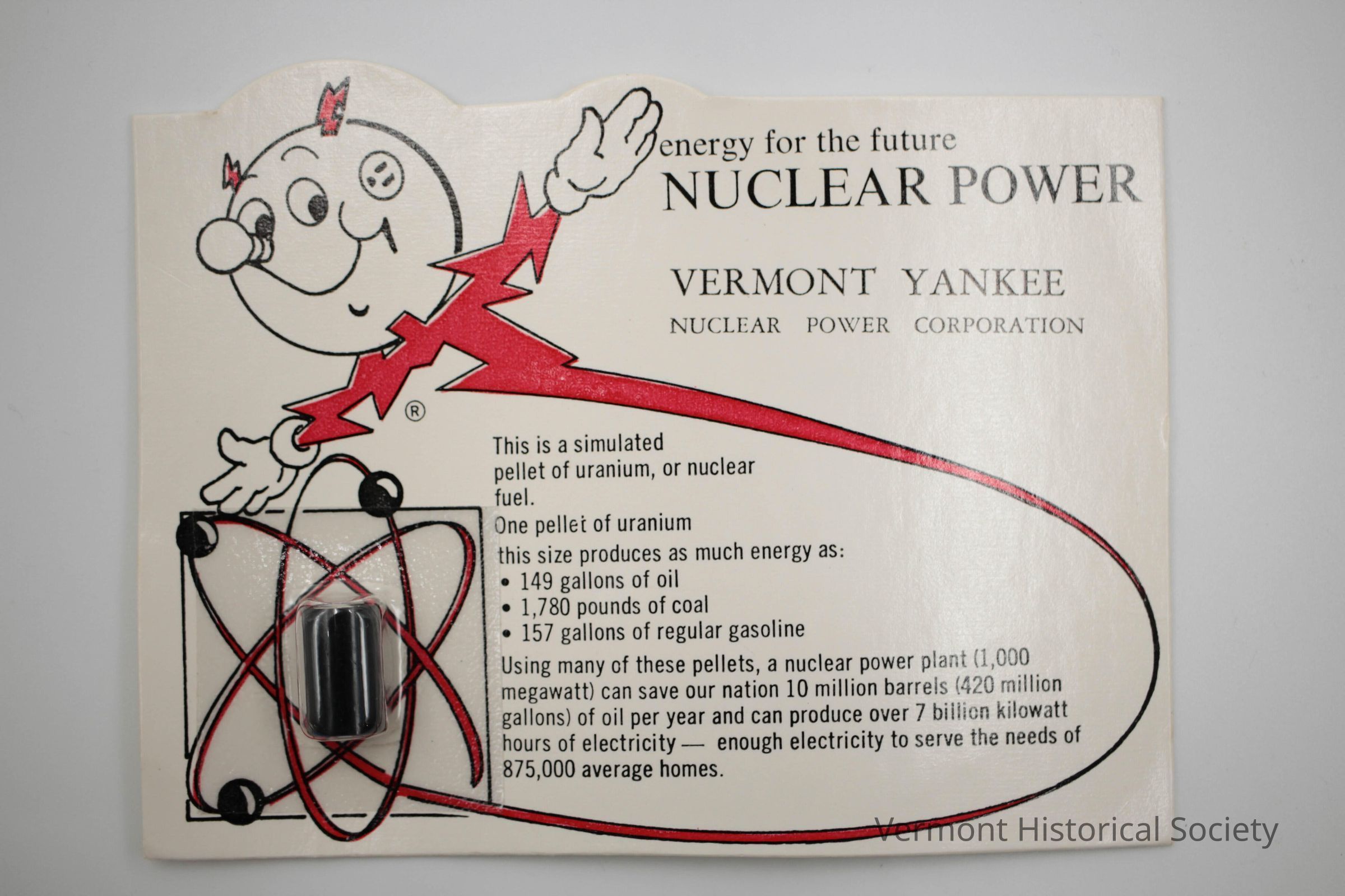 White cardstock card with a black pellet mounted in the lower left corner under plastic. The card is printed with an image of a cartoon character with a round head, a lightbulb nose, and a red lightning bolt for a body. The body curves around the card and terminates in an atomic spiral around the pellet. The top of the card reads, "energy for the future NUCLEAR POWER / VERMONT YANKEE NUCLEAR POWER CORPORATION". Between the pellet and the cartoon's body is an explanation that the pellet is simulated uranium, and details about how much power uranium can produce.Context