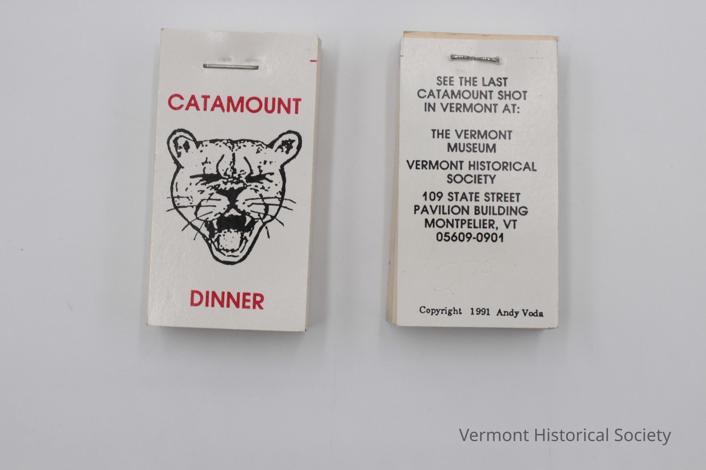 Small flip book with an image of a roaring panther face and the inscription, "CATAMOUNT DINNER" on the cover. The inside is filled with a series of illustrations that, when flipped, show a panther attacking a deer. The back cover is printed with the inscription, "SEE THE LAST CATAMOUNT CHOT IN VERMONT AT: THE VERMONT MUSEUM VERMONT HISTORICAL SOCIETY 109 STATE STREET PAVILION BUILDING MONTPELIER, VT 05609-0901 Copyright 1991 Andy Voda". The book is bound with a single staple at the top.Context