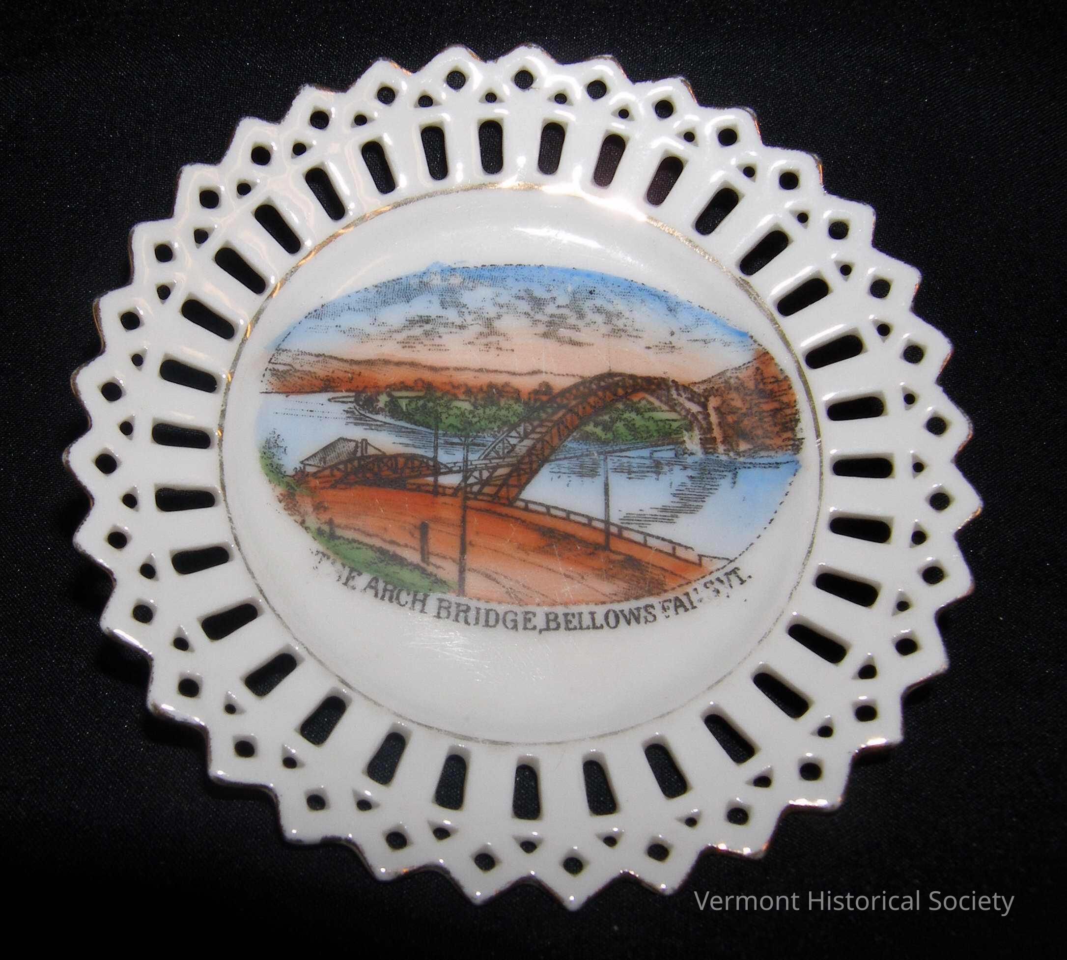 Small white saucer with pierced rim in a latticework pattern. The center is printed with a full-color illustration of a long, tied-arch bridge over a river. The illustration is labeled, "NEW IRON BRIDGE, BELLOWS FALLS, VT."