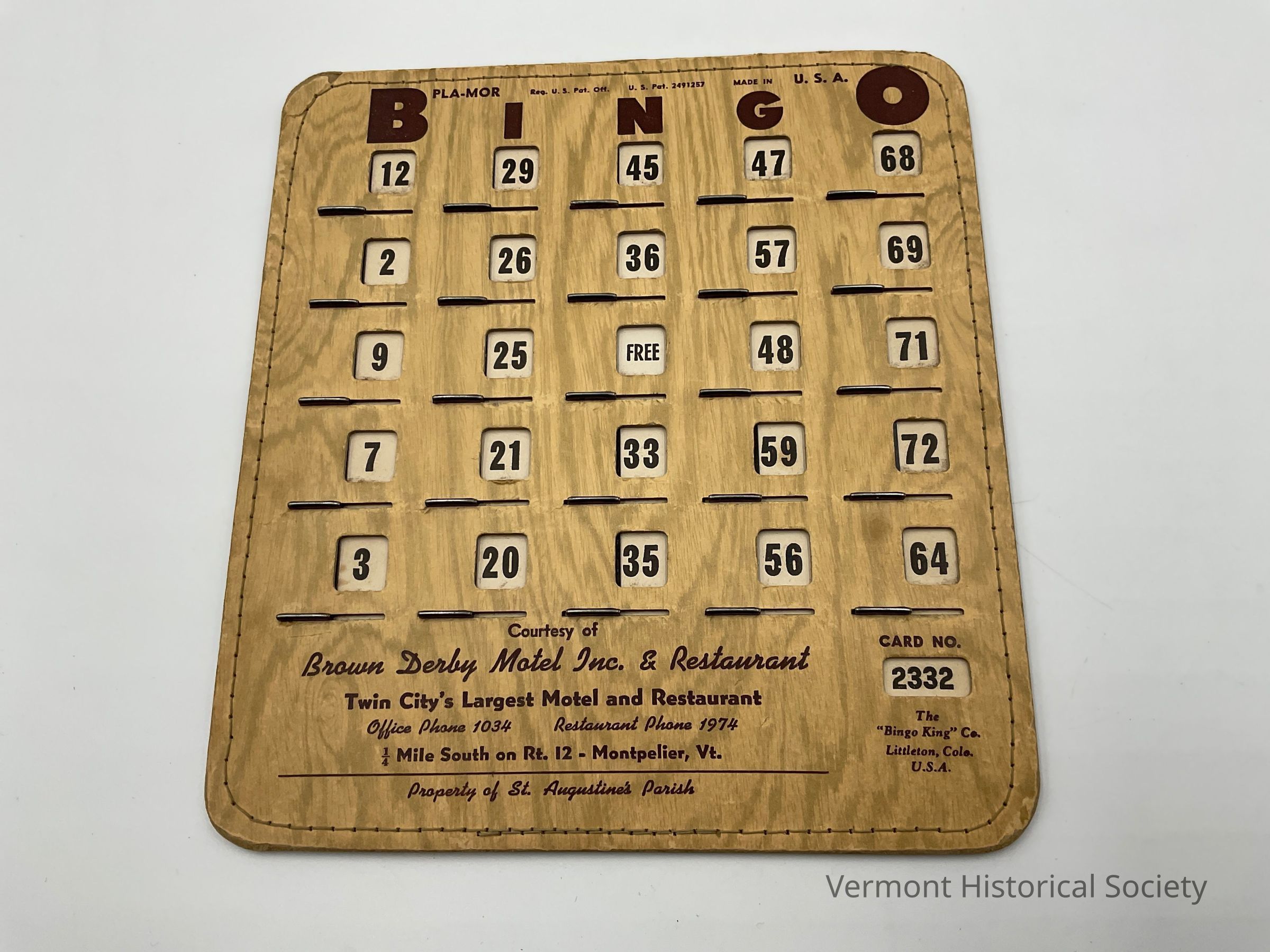 Cardboard bingo card printed with a faux bois pattern. The card has 26 windows carved into the face that show paper numbers beneath. 24 of the windows show 2-digit numbers, 1 shows the word "FREE", and 1 shows a 4-digit card number. The bottom of the card is printed with an advertisement for Brown Derby Motel Inc. & Restaurant in Montpelier, Vermont.