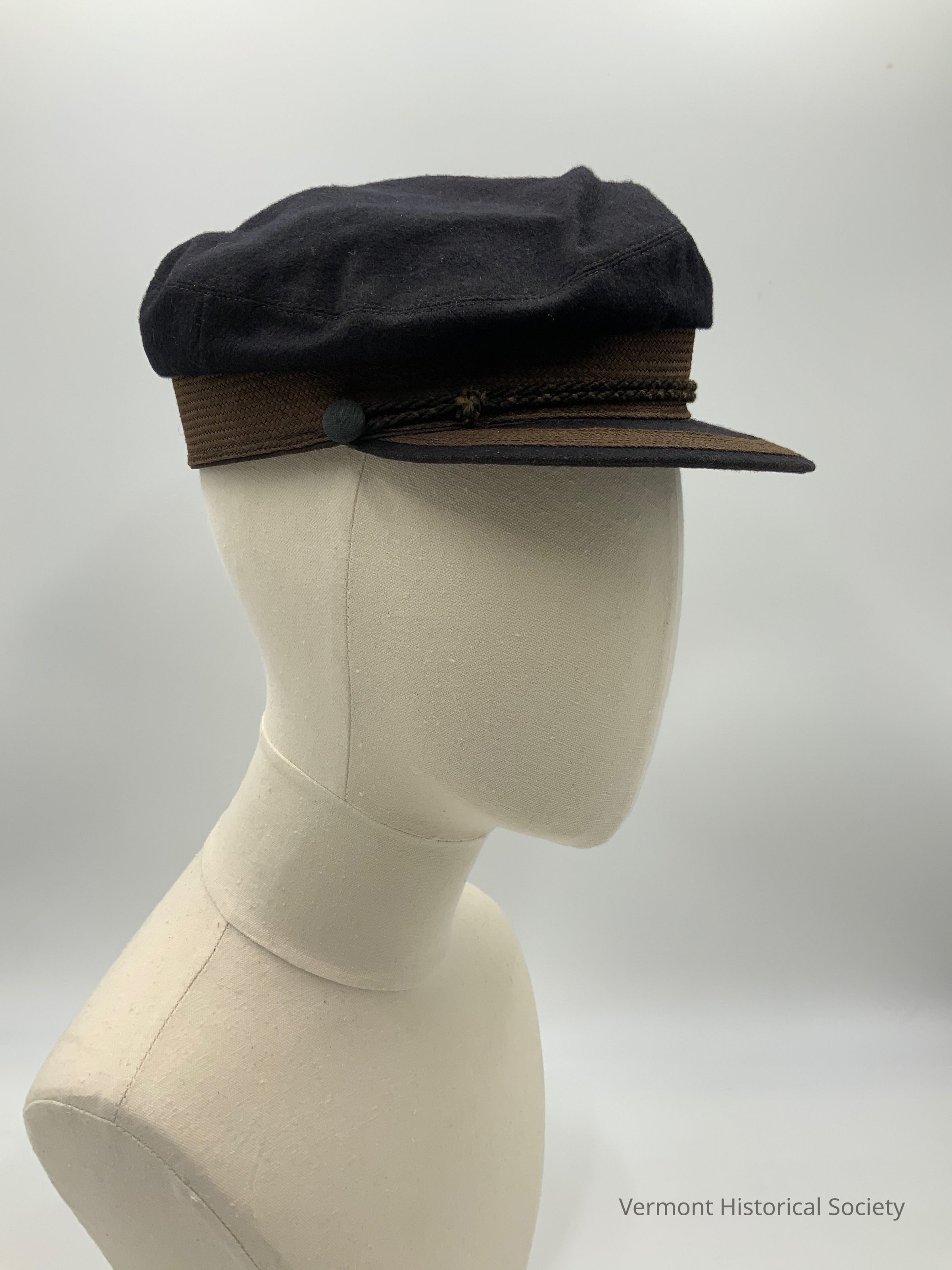 Black wool military-style cap. The crown is soft and stitched down to fall forward to the left. It has a short, rounded brim in the front. The brim and the base of the crown are decorated with brown twill tape. There are fabric-covered buttons on either side of the brim connected with a silk cord across the front of the hat.Context