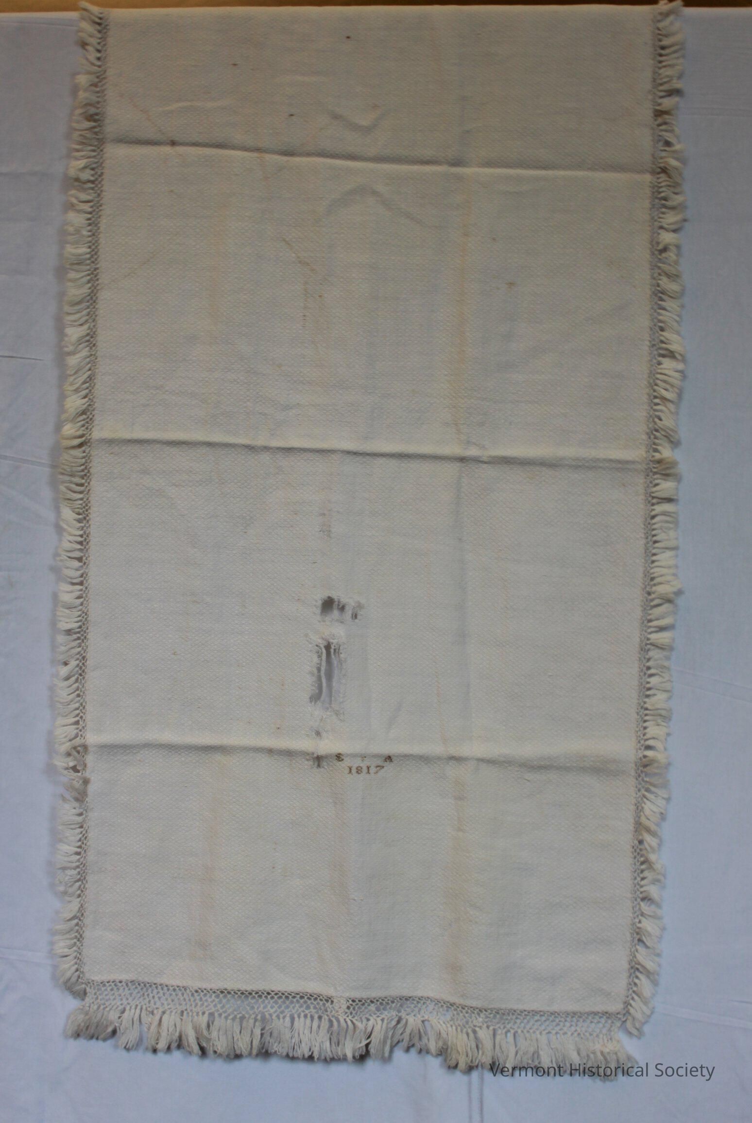 Rectangular linen bureau scarf with a knotted fringe border. The label "S * A 1817" is stitched into the center of one end.