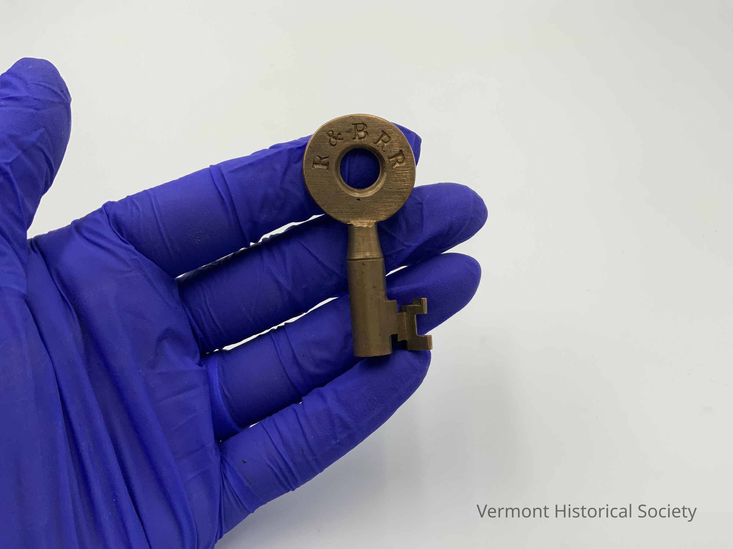 Key with round head. The head is stamped with the label "R & B R R" on one side and "WILLIAMS & PAGE" on the other side. The end opposite the head has a protruding bit with two widely set wards.Context