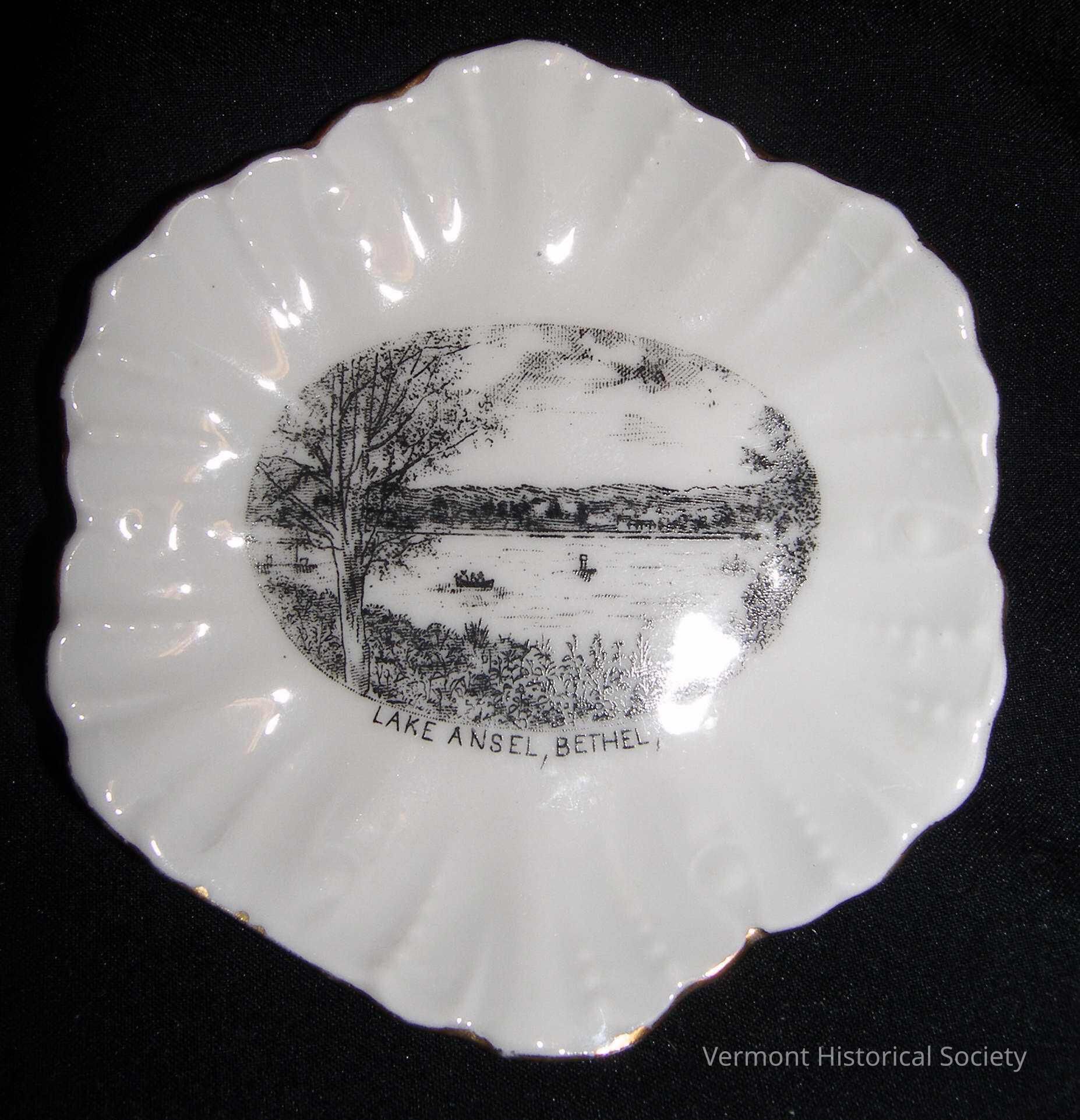 Cup plate with petaled edge. The center is printed with a copperplate illustration of a lake. The image is labeled, "LAKE ANSEL, BETHL, VT." The back of the dish is marked, "Made in Austria expressly for Brooks & La Due Bethel, Vt."