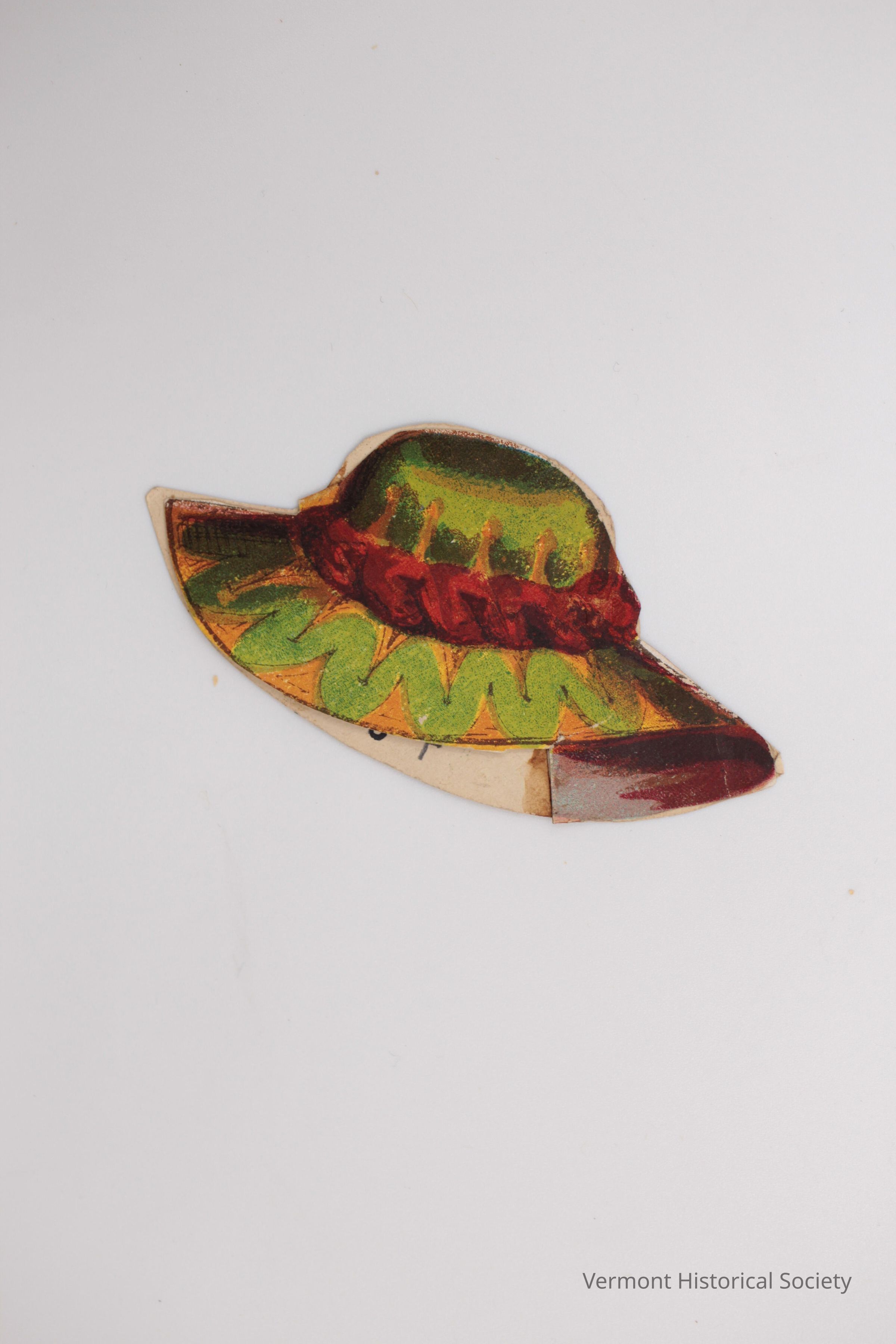 Two-sided hat for a paper doll. The hat has a wide brim and is yellow and green with red around the base of the crown. There is a slit at the bottom to slide in the doll's head.