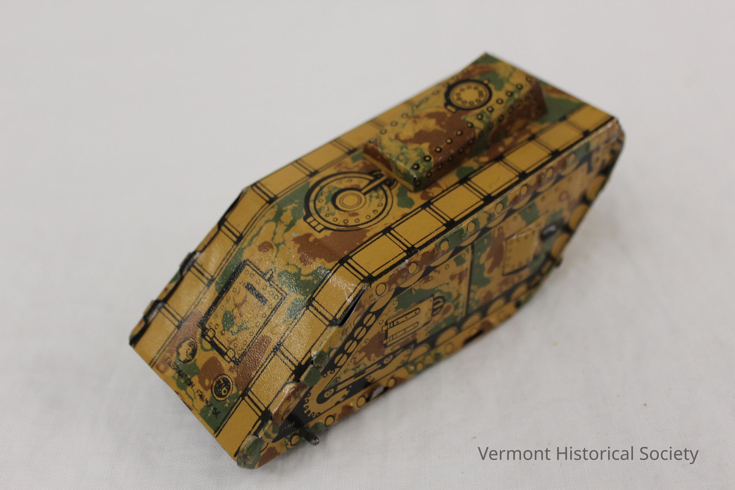 A tin tank painted in beige and green and brown camoflage pattern. Narrow wheels on tiny rods. One doesn't stay in its hole very well.Context